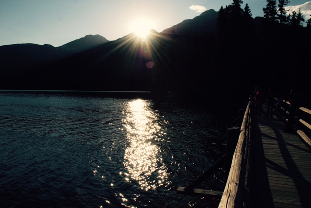 DAY 6 --- 清晨7:30 离开banff 前往 jasper, 冰原大道 icefiled parkway 也就是北美93 号公路。一路上只有我们一辆汽车在行驶,真是得瑟!沿途的风景实在是太美了!令人惊叹于洛基山脉的无限风光。湖泊,湿地,瀑布,林海,冰原,雪山,勾成了一幅幅无比壮观的自然景色。John 提议我们一路开一路停,沿途观景 bow lake, pyteo lake, Athabaskan falls, waterfowl lake 等等。沿途还时而遇见从林子里走出来打召呼的野生动物 ( 黑態和鹿),使我们的旅程增添了不少情趣。当日傍晚,我们又观赏了 Patricia lake and pyramid lake. 为了让 Lawrence 能拍到一张满意的sunset 照,大家陪他在桥上足足等了40分钟。拍摄了这张黄昏照。