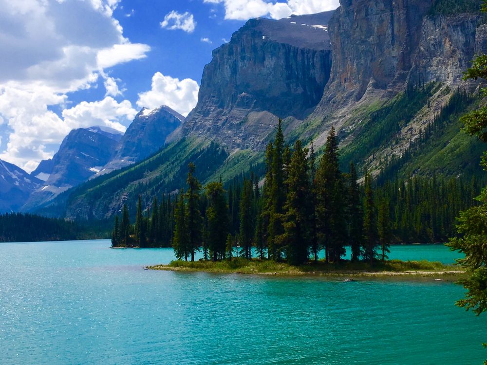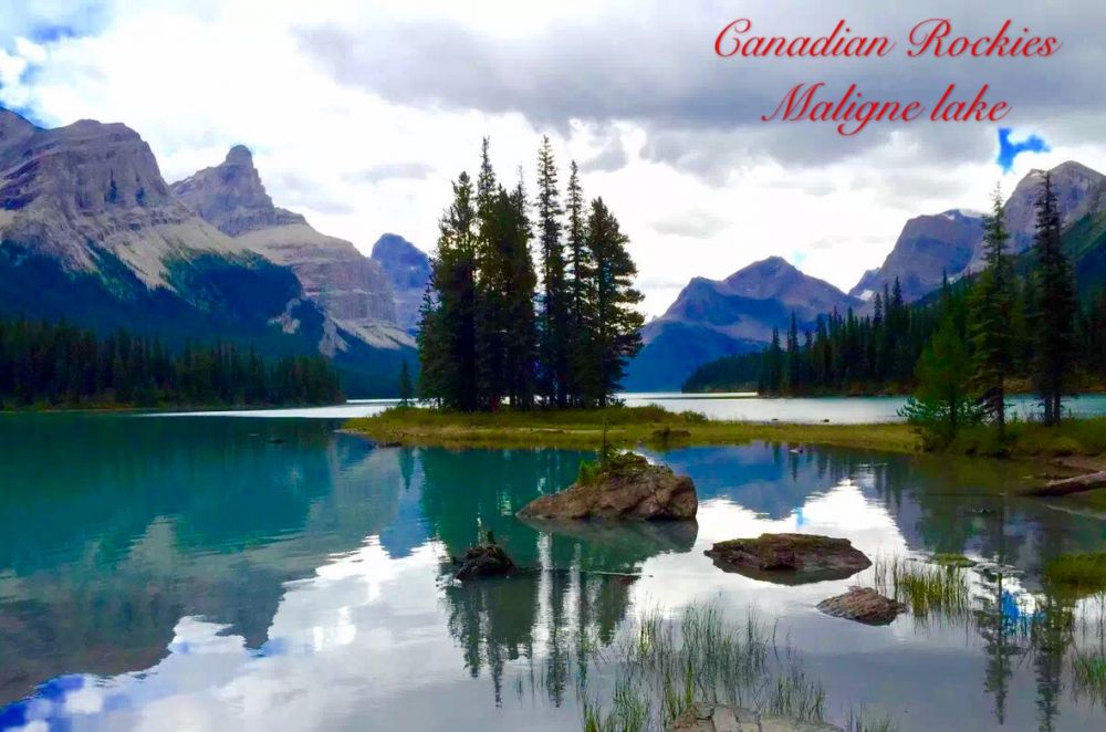 spirit island . 行驶在湖幅缩窄仅为200米的精灵岛,我和John 整个行程一直站在船尾的夹板上,欣赏着如诗如画般的美景,当游船游到湖中时,湖光山色的风景苑如人间仙境,令人如痴如醉。最后到达美丽的精灵岛,岛上点缀着苍翠笔直的针叶林,山峰和树木的倒影无比清晰地荡漾在湖中,天空的云朵如碎絮一样地倒映在湖中,造型无比美丽,于是,我摄下了这张此行最为满意的风景美照。
