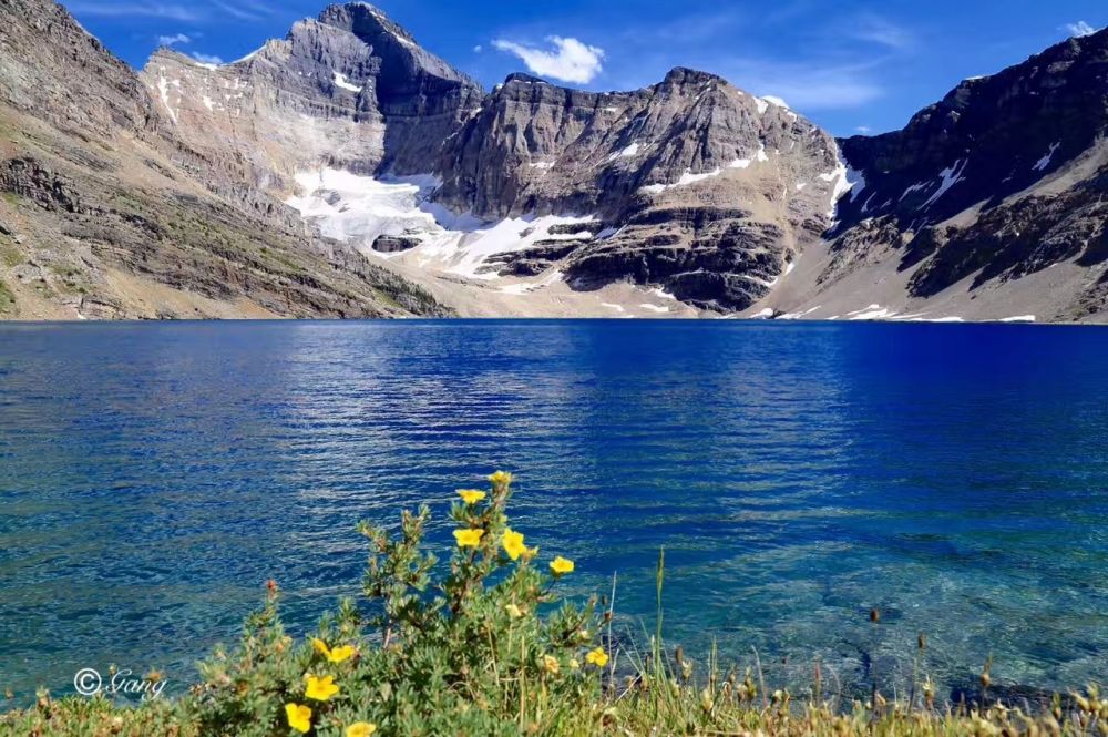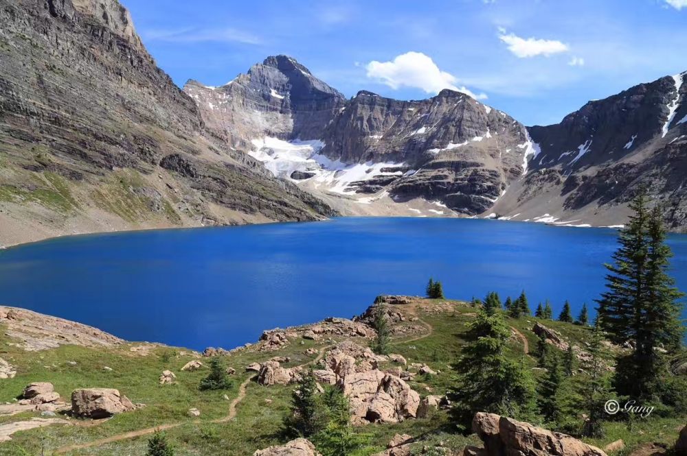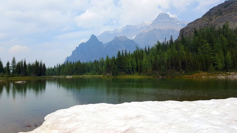 离开小木屋,接着向前走,不一会就到了Schaffer Lake,这是一个很浅的湖,岸边还有积雪,浅绿色的湖水很是漂亮。