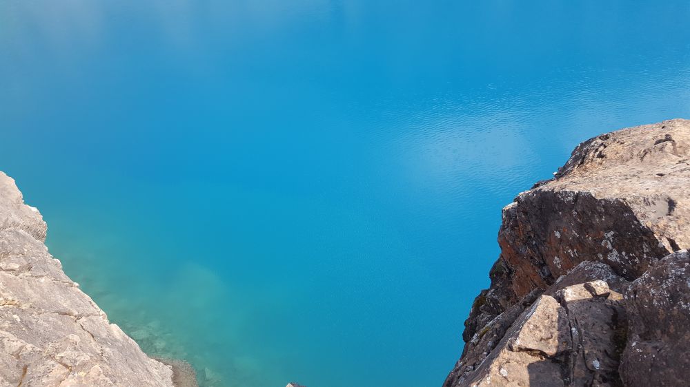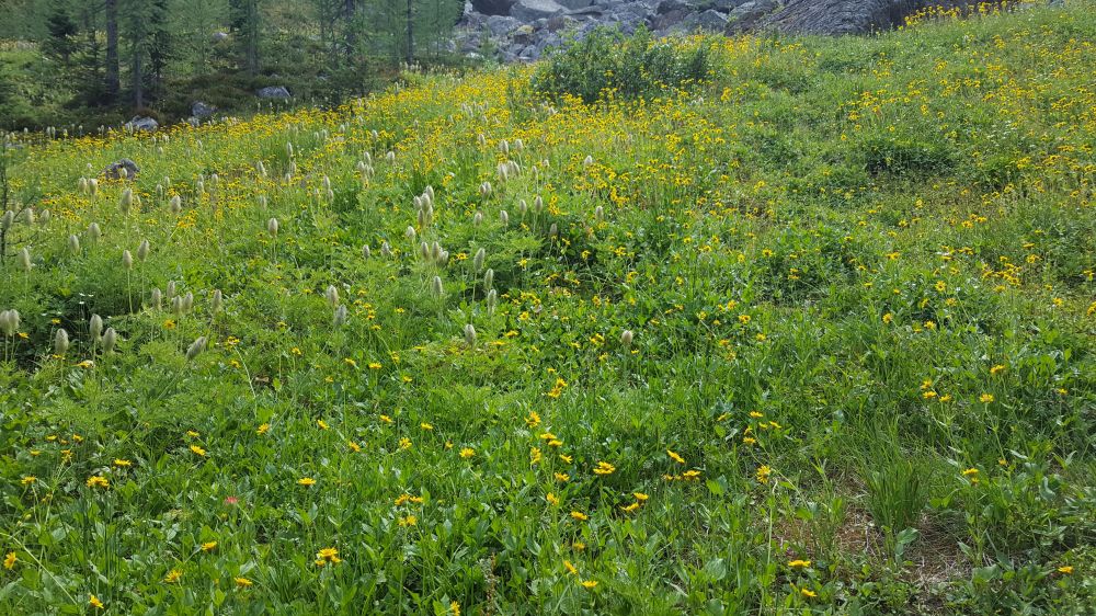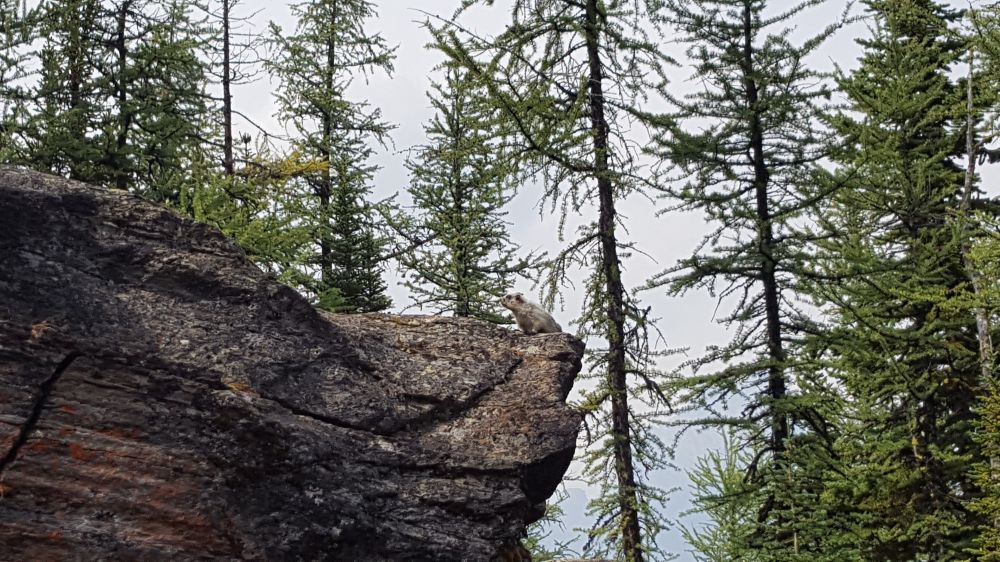 接着前行,翻过一个小山包,到了Odaray Highline Trail,正打算往前走,一个正在干活的工作人员说每天只允许4拨人前往, 我们已经晚了,不让进去。那里可以登高几远望Lake McArthur, 不让去也之能作罢。再沿原路前行路变得崎岖起来,路也越来越窄,越来越陡,很多地方都是在悬崖上行走,大约1-2尺宽的路,旁边就是悬崖。大约1个多小时到了Lake McArthur,可惜因为BC多处山火弥漫,导致这里也是PM2.5极高,没有看到蓝宝石般平静的湖面。下图一个是湖面远景,一个是近处的湖水,确实漂亮。同时贴上朋友的两个照片作为对比(后两个)。有遗憾也好,正好给自己一个下次再来的借口。