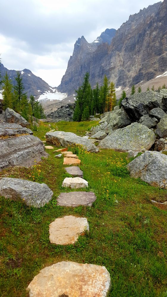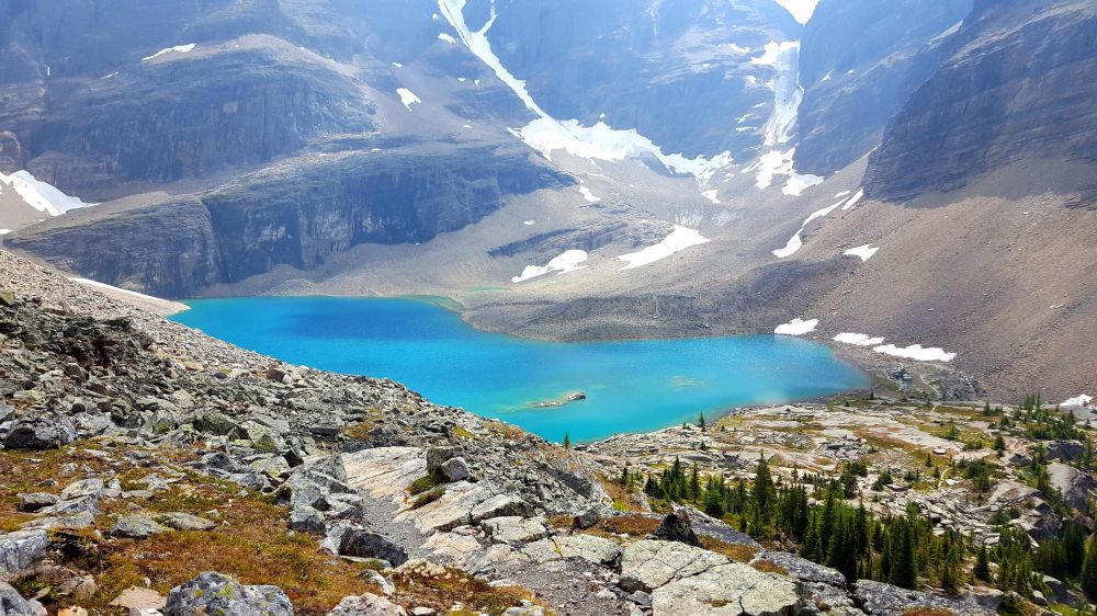 在Oesa Lake简单吃了午饭,沿着Yukness Ledges前往Opabin Lake,这里几乎没有路,都是从或大或小的乱石上行走。在这里可以同时看到Lake O'Hara和Mary Lake。