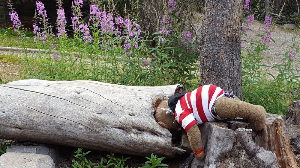 5点半左右回到Lake O'Hara, 看到老太太依然在问询处,一番问候后老太太拿出她每次来这里必然带的Cameron,一个玩具熊,摆了几个造型,照了照片我们就告辞上车返回了,今天徒步16公里,爬高870米。圆满完成了这次Lake O'Hara之旅。