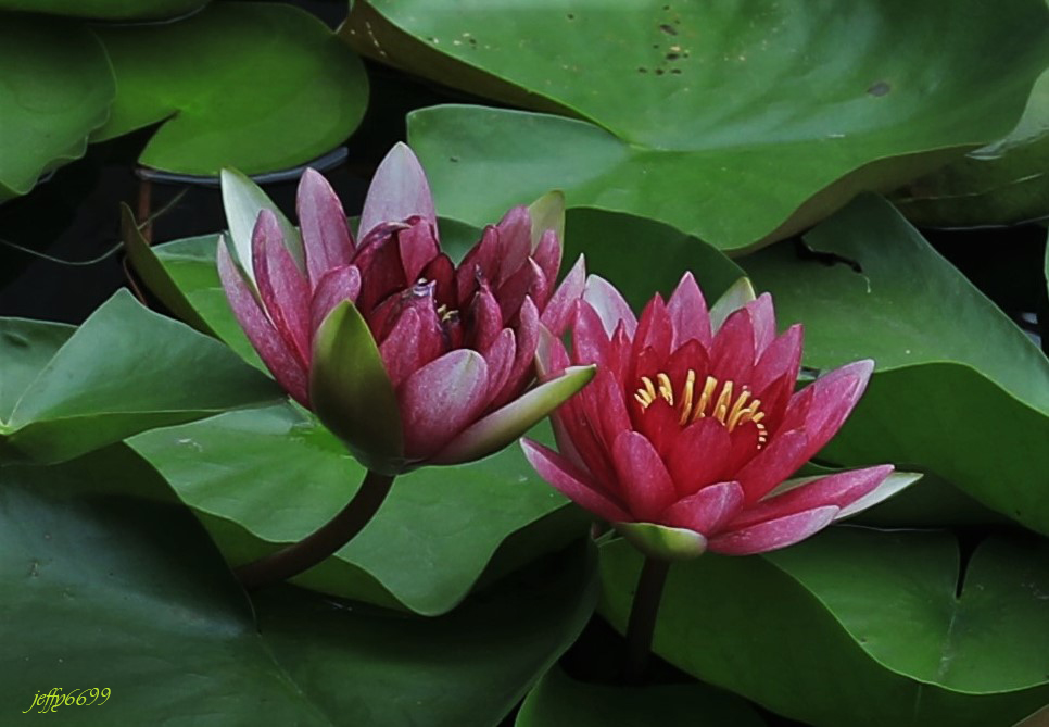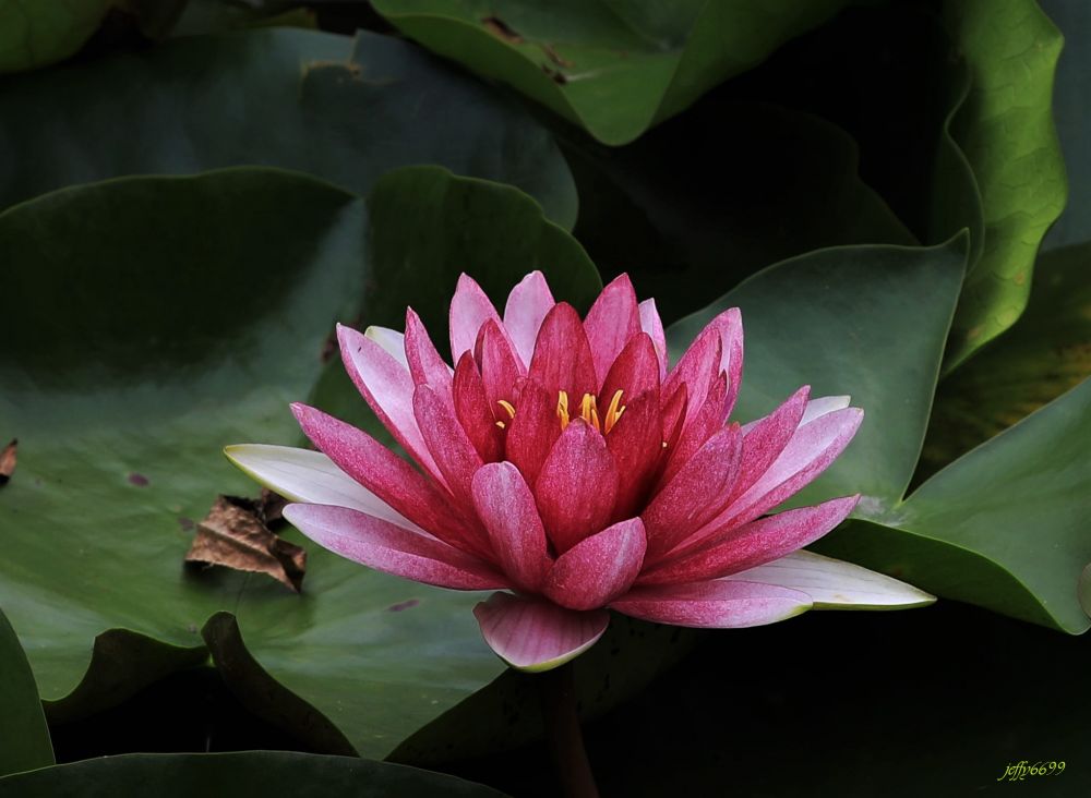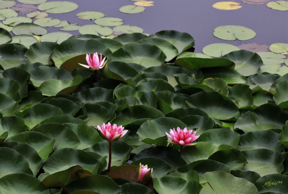 睡莲也叫莲花,但叶和花只飘浮在水面,青山远空,含蓄自芳。