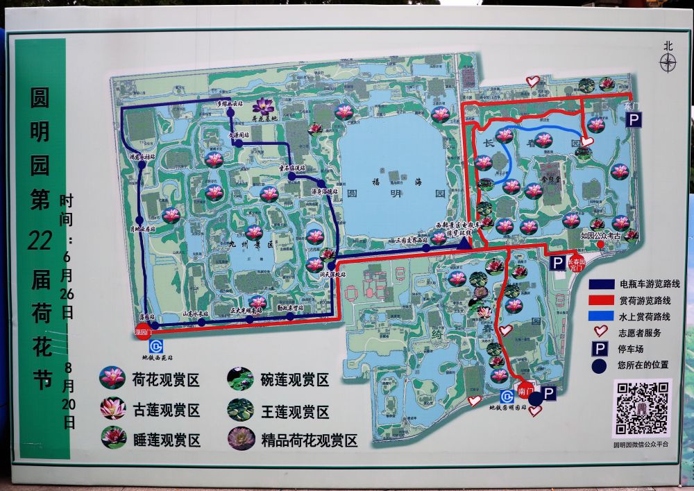 圆明园有四大园区,赏荷赏莲区遍布全园,水陆两路都可抵达。