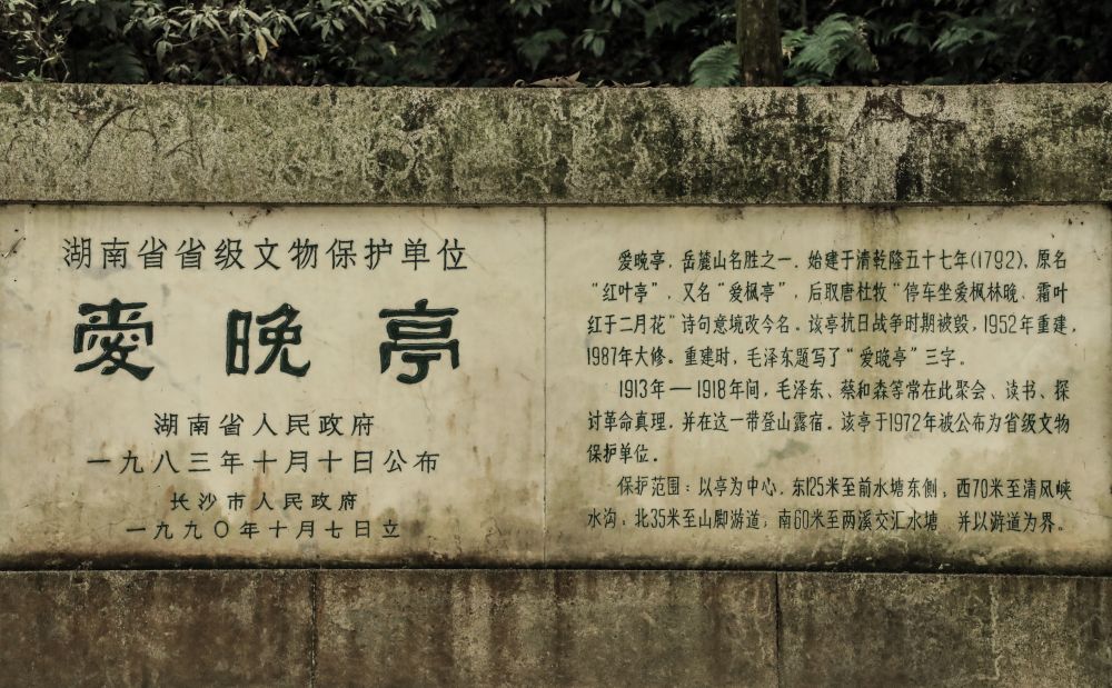 爱晚亭建于1792年,与安徽滁县的醉翁亭(1046年)、杭州西湖的湖心亭(1552年)、北京陶然亭公园的陶然亭(1695年)并称中国四大名亭。