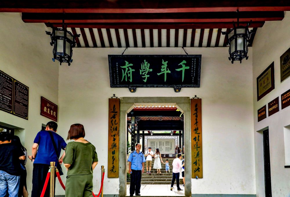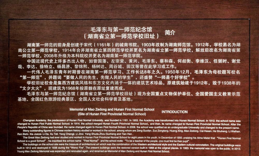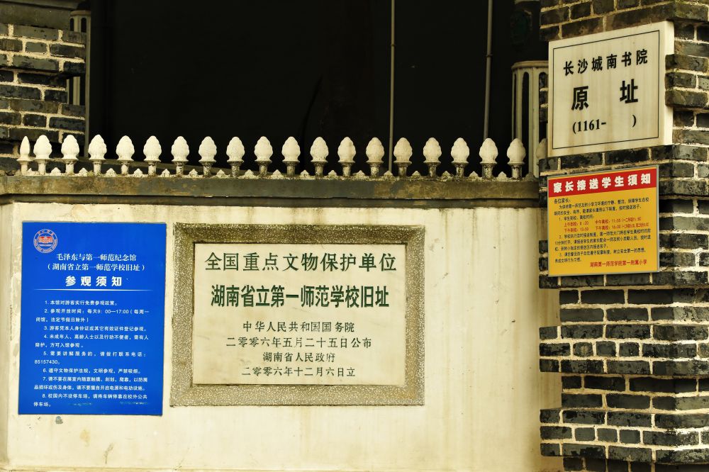 第一师范历史悠久,前身是创建于宋代(1161)的城南学院。名人校友里还有曾国藩等一批人。现在也是全国文物保护单位。楼顶的“第一师范”四字应该是毛泽东在1950年所题。