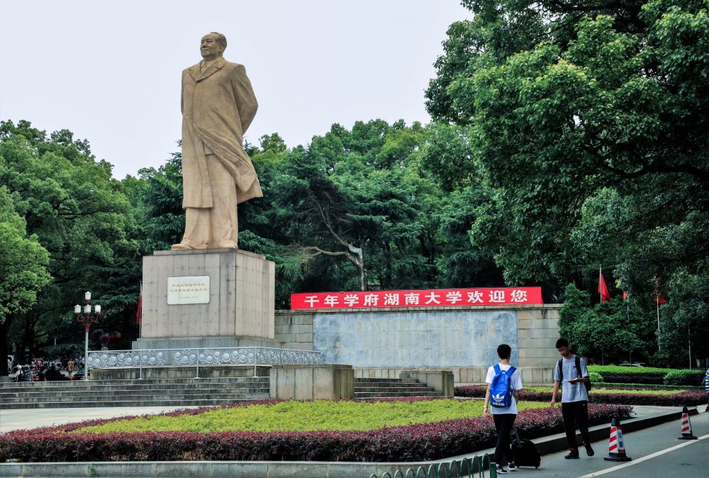 不过最抢眼的还是后面写着“千年学府湖南大学欢迎您”的大红长幅。这表明了这雕像是湖南大学立的。两个大学生悠然走过, 也仿佛是说这里是湖南大学的地盘了。