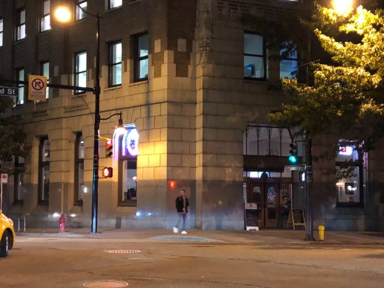 买到冰淇淋后如果已是华灯初上时分,可北上回海边,边用冰淇淋边赏海景。这时会看到和刚才完全不同的景色。伴着夜色,月光和多彩的灯火,对面的山色映在静静的水面上。微风中吃完手中的冰淇淋,那感觉,真想再吃一个冰淇淋。起身回行,来到一个满身雕饰的建筑前,(385 Burrard Street) 这是个古老的办公楼,里外都很好看。这都不是关键,关键是一楼有个酒吧,吧内可上厕所。吃了冰淇淋又在海边吹了风,还不让找个地儿方便方便呀。再说这建筑可是上了温哥华著名景点榜的。出了酒吧,该回府休息了吧?错了,这才那到那呀?真正的节目才刚要开始。继续前行,开始我们的Vancouver by night!