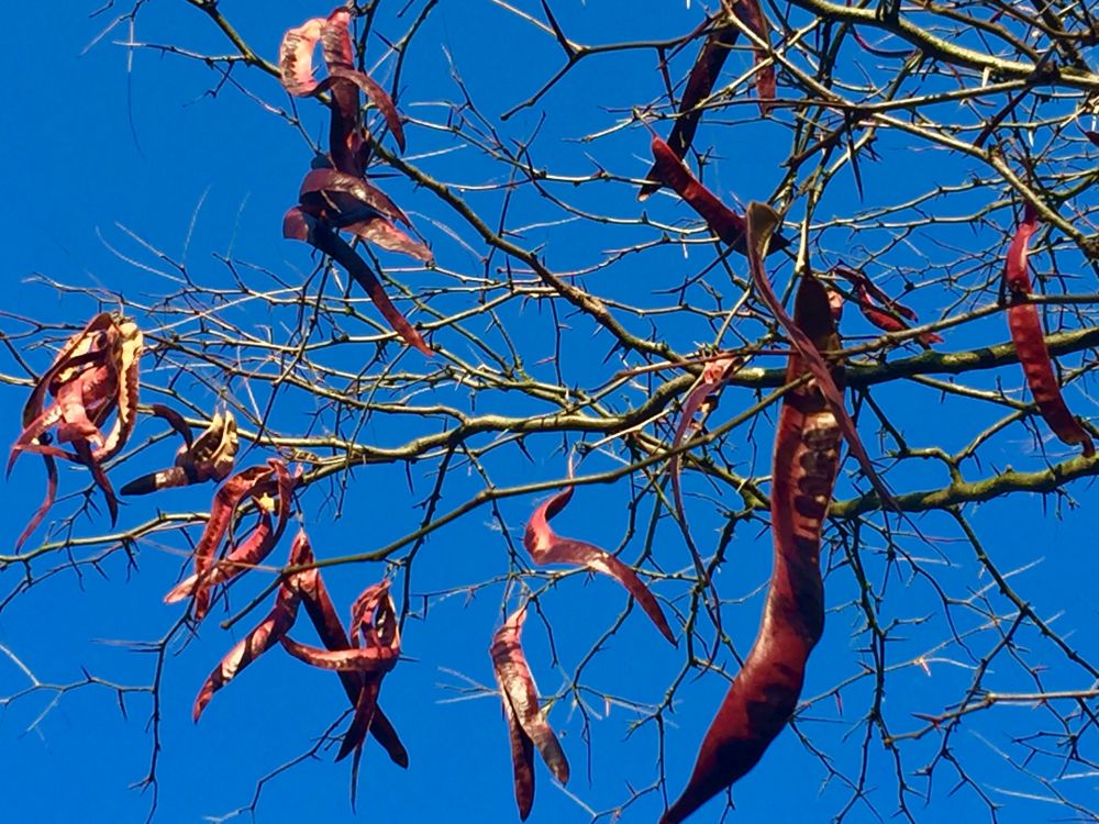 再后来就在湛蓝的天空里看见了这些豆荚。它们被称为“弯曲的豆科灌木种子荚”属于合欢科一类的植物。