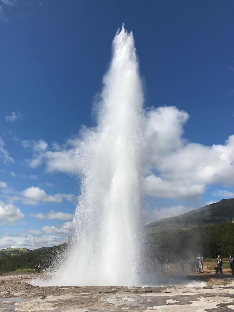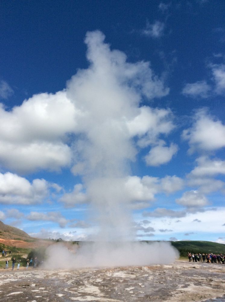 没有这个顶级间歇泉的吸引,人们仍然“万国来朝”,看它的“小弟”施托克(Strokkur)间歇泉的表演。对于我们来说,它没有美国黄石公园的间歇泉规模大,震撼力强。但相同的是,它们都有一股浓浓的硫磺味道。看着每隔八分钟左右慢慢沸腾的水从平静,到焦躁,到愤怒,最后“怒发冲冠”。高达百度以上的沸水在晴空下直冲云霄20米高,随即化作琼珠碎玉落下,落下的温润水丝随风飘散,浸湿脸颊。那一霎那,还是觉得奇妙和美好。