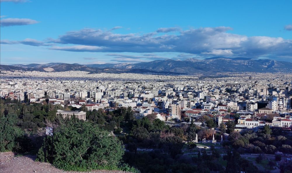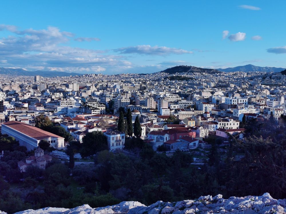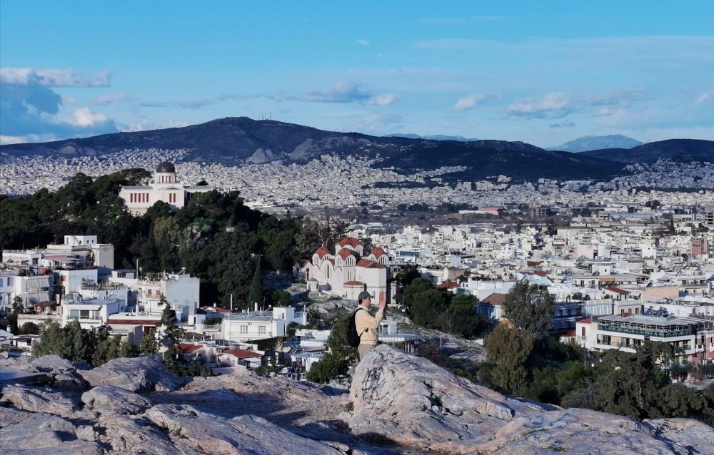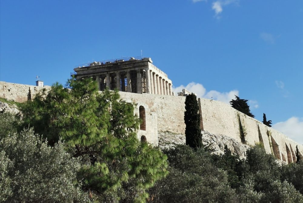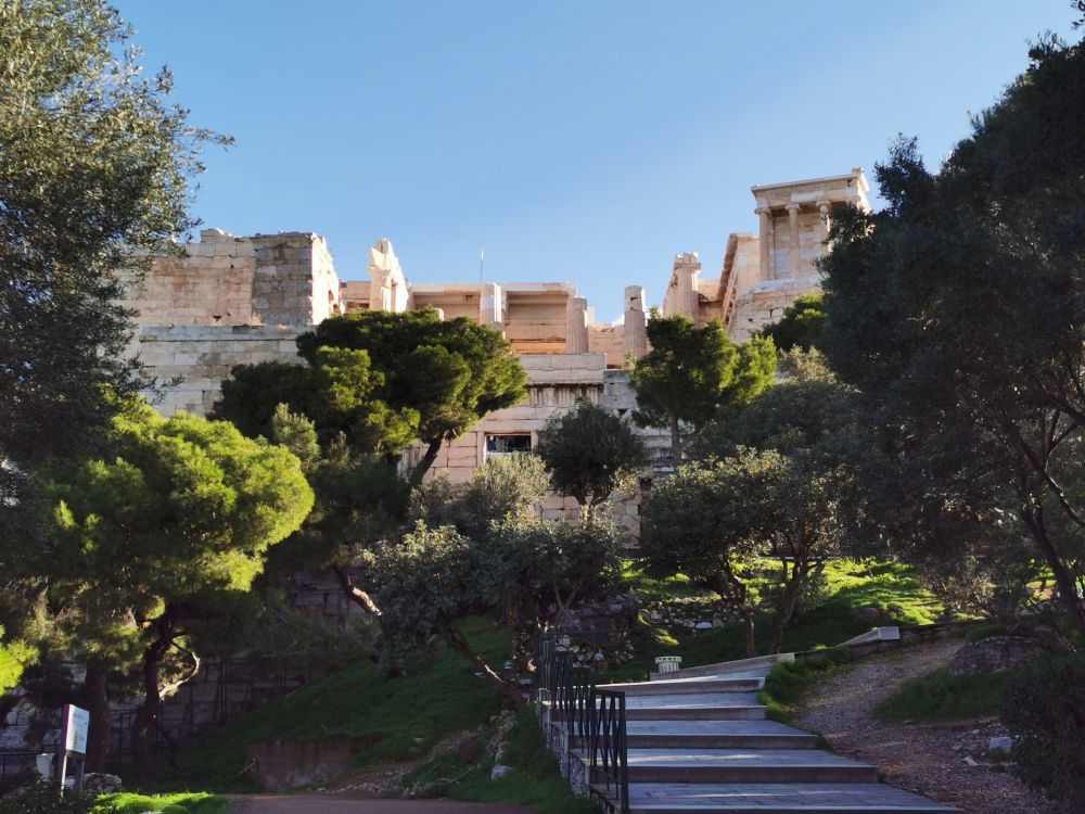 在走近我心心念的“情郎”之前,会经过亚略巴古岩石山(Areopagus Hill)。站在岩石山上,眺望雅典市景和远处的群山及爱琴海,似乎强盛的雅典城邦正在这里指点江山,把民主和科学的种子从这里向外喷洒,恩泽世间。地形的优势,让这里天生就该是议事和审判之地。希腊神话中的战神阿瑞斯因谋杀海神波塞冬而在这里接受众神的审判;古希腊悲剧作家所写的《复仇女神》中,男主人公因弑母而被带到这里受审;公元前4世纪,一位以美貌闻名的希腊名妓被控亵渎神明而在这里被处死。可当她露出完美的酮体,在场的法官为之惊呼,认为她的美体是神明的杰作,当即无罪释放;希腊古典时期,这里是雅典城元老权贵们的集会场所,这是今天参议院的鼻祖。但这些有巨大权利的终身制参议员们因民主领袖的改革方案而被撤销绝大部分权利,仅保留刑事案件的审判权,最后形成现代希腊的最高法院;在《圣经》中,这里是使徒保罗发表那篇不朽演说的讲道之地:“你们所不认识而敬拜的,我现在告诉你们。创造宇宙和其中万物的上帝,既是天地的主,就不住人手所造的殿,也不用人手服事,自己倒将生命、气息、万物,赐给万人。” 随着这篇铿锵有力、气势磅礴的演说,亚略巴古这个名字也永远留在了基督徒的世界中。
