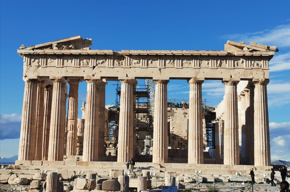 神庙内供奉的雅典娜女神雕像,以黄金和象牙打造,眼睛的瞳孔由宝石镶成,在昏暗的神庙中金光闪烁。这个从雅典各个方向都可以看到的帕特农神庙,点点滴滴都浸透着大师们的伟大,但这些伟大我们却无缘亲见,只能让自己的想象插上翅膀,飞回千年前的雅典城邦,去瞻仰大师们的非凡作品。今天,我们的目力所及,就是那些是因氧化而变成乳白偏红色的旧大理石和纯白的新大理石构建出的断壁残垣,虽不完整,但我们仍然可以看到它的力与美、典雅与雄壮、雅致与清朗,那是艺术与技术的结合,那是理性和感性的交融。
