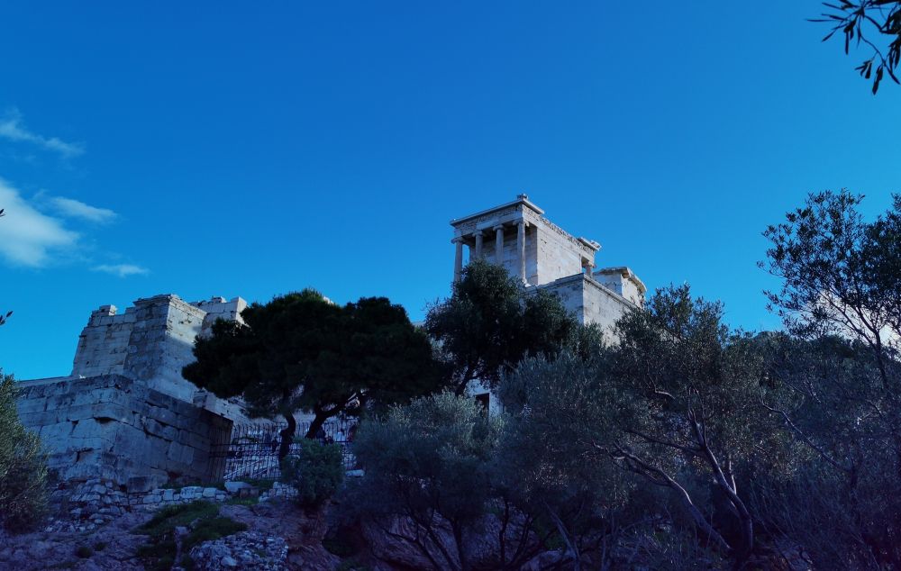 让我悲悯的还有山门西侧上方的雅典娜胜利女神庙(Temple of Athena Nike)。这位代表智慧、技艺和胜利的女神虽能量无边,却没有能力保护自己的住所,更没有能力保护自己健全的身体。神庙在土耳其人同威尼斯人的战争中被摧毁,双翼也被雅典市民砍下,以确保胜利永驻。可怜的神啊,你们斗不过人类的凶残。