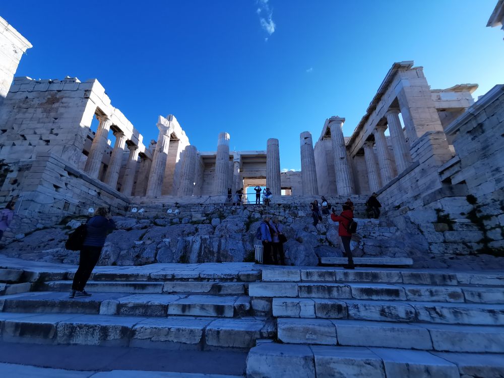 不急不缓走到约会地的入口,那是雄伟壮观的卫城山门(Propylaea)。在看到它的那一瞬,我禁不住心疼。它断壁残垣的样子,就像心上人欲靠近我,却又因无法靠近而忧伤的样子。建于公元前五世纪的它,曾是古希腊人朝拜雅典娜的第一站。从这里开始,雅典人前无古人的设计和建筑光芒开始显现。这座通往卫城的“H”形入口,主体是6根立柱组成的门廊,两侧是加盖屋顶的附属建筑,这让山门的建筑比例更加协调。为了保持建在山坡上的山门和凹凸不平的地面能够达到统一平衡的视觉效果,山门前后两部分断开,中间用柱廊连接,形成前后两个相对独立的立面。柱廊东侧是画廊,而西侧是供车辆和行人分别出入的通廊,这是今天机动车道和人行道的祖师爷。通廊内部的柱子高挑纤细,而外部的柱子粗壮坚固,就像充满阳刚之气的男性和优美柔和的女性,恰到好处形成鲜明的对比,让内外层次感分明。向上仰望,是被称为“从古至今都无可匹敌的屋顶”。屋顶是涂成蓝色的大理石花格镶板,上面画满了金色的星星。而如今,“风华正茂”的山门已不在,只留下被修复的基本架构和几根残破的立柱,真是“满目山河空念远,落花风雨更伤春。”