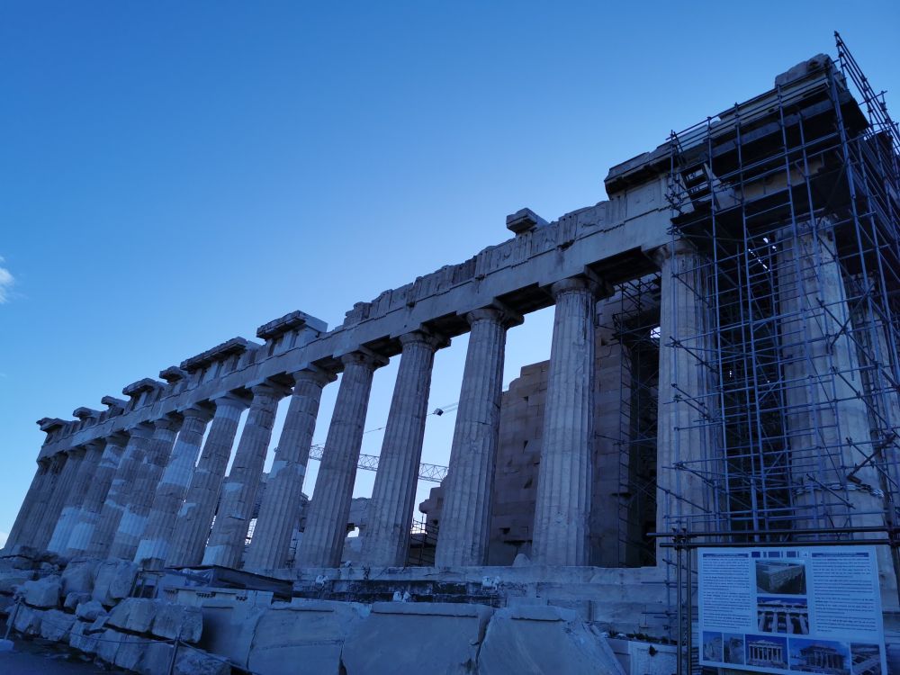 耸立在卫城中心的帕特农神庙(Parthenon Temple),古典希腊时期最重要的建筑之一,就是人类争斗的牺牲品,是“金剑已沉埋”。残破不堪的它,似乎永远都无法停下被修复的脚步。在历史的长河里,这座世界上最早的古代大庙宇无数次被践踏。它被摧残的历史,几乎就是一部简洁的欧洲史。波斯人烧毁过它,古罗马将其改造成圣母教堂,后变成带钟塔的罗马式基督教堂。奥斯曼土耳其时代,它是一座清真寺,后变成军火库。不幸的是,威尼斯人的炮弹打中了它,军火库爆炸,这让它差不多变成了废墟。祸不单行,19世纪初,它仅存的精美雕刻也被英国人偷走6成,二战期间被纳粹法西斯占领,直到19世纪下半叶开始被修复。