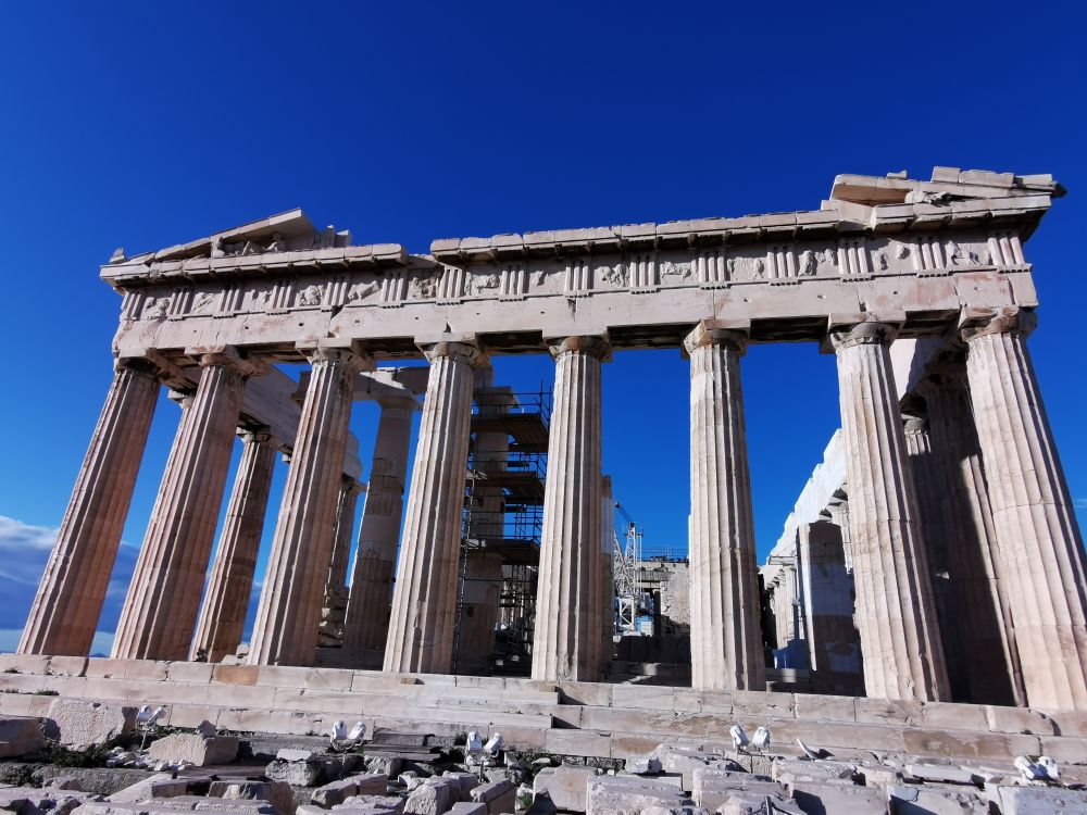 多灾多难的帕特农神庙,举世闻名的古代七大奇观之一,就这样在岁月中蹉跎,让今天的我们只能在想象中凭吊它的伟大,遥想它的芳华。如果说卫城是古典希腊建筑雕刻艺术的顶峰,那帕特农神庙则是这顶峰中的精髓,是希腊建筑艺术的纪念碑,是“神庙中的神庙”。为歌颂雅典战胜波斯而建的它,通体由白色大理石建造,远远望去就气势如虹,光彩照人。那处处按黄金比例建成的立柱给人如临帝王之门的感觉,同时这些立柱也根据地形进行精确的细节矫正,用视觉差异加强效果,用基座四面向中间微微凸起及拐弯处圆柱对角线倾斜去体现动态平衡的生命美感,这是现存建筑最具均衡美感的伟大建筑。