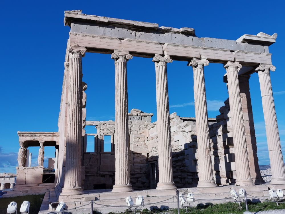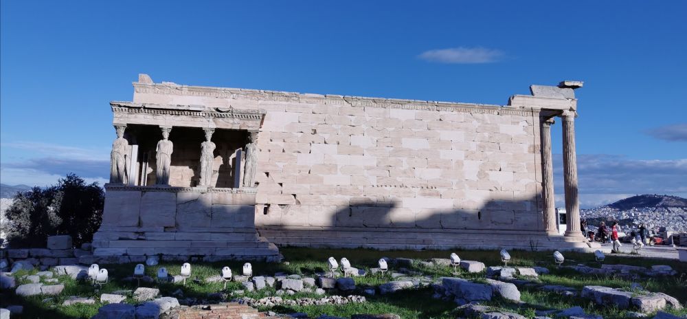 在祭拜雅典娜的帕特农神庙旁边,是伊瑞克提翁神庙(Erechtheion)。如果帕特农神庙是壮美,那供奉雅典保护神们的伊瑞克提翁神庙则是秀美。在看到它的那一刻,我对古希腊人的创造力和想象力真是佩服得五体投地。建于公元前5世纪的它,居然用六尊优美的少女像作廊台的列柱。虽然六个少女像的真品在《卫城博物馆》只有5个,其中一个还无头,但我还是把这些真品仔仔细细研究个遍。这些身穿束胸长裙,衣带飘飘的少女们不仅面容和神情不同,而且衣着和发型也不同,各具特色,姿态万千。最重要的是,古希腊的设计师为少女加上了浓密的披肩发,巧妙掩盖了人形雕塑中最细、最脆弱的脖子部分,解决了承重与美观双重问题。这么精妙的设计,真是伟大的创新神作,令人叹为观止,难怪是建筑奇迹之一。
