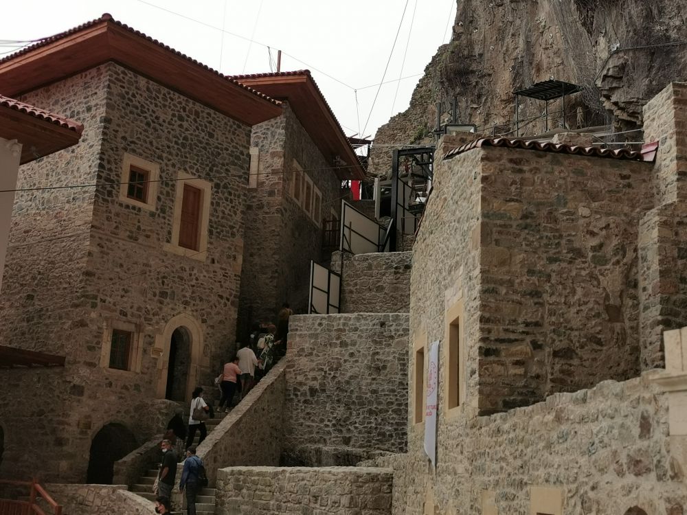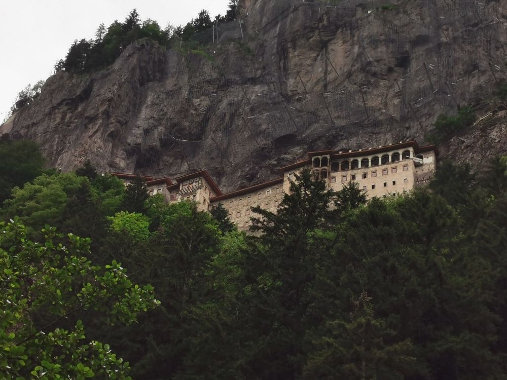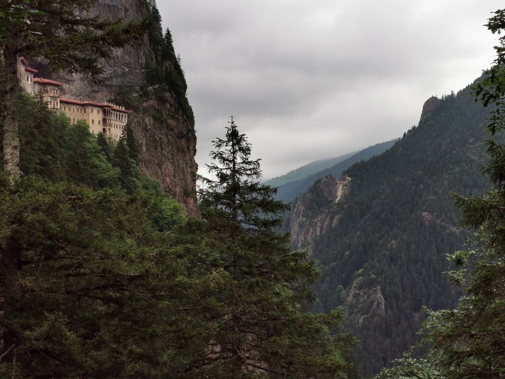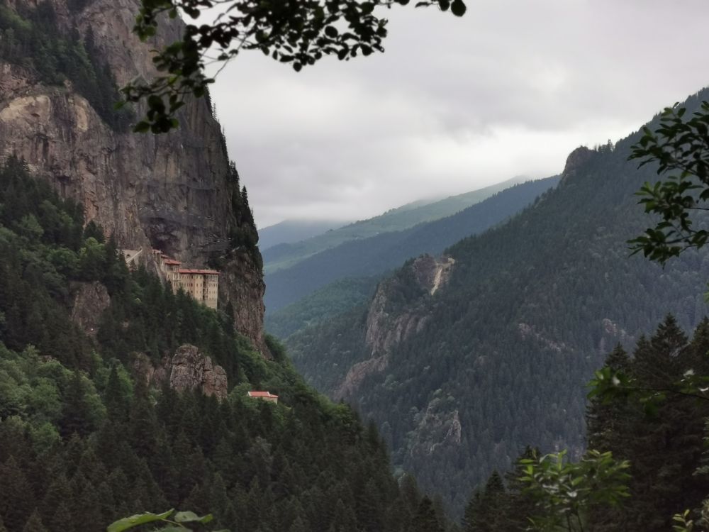 我在跟挪威一样,会让我永不厌倦的美景中缓缓盘山而行,穿过一个小镇后不久就开进了苏美拉修道院所在的群山中。这群山,跟中国的很多山并无相异之处,幽静、清新。难得的是,这里飘起了雨丝。离开爱琴海岸的特洛伊,我在土耳其就再也没见过一丁点儿的乌云密布,更别说细雨霏霏了。更幸运的是,土耳其的封国政策在6月30号结束,在此之前,很多博物馆都关闭,也包括此修道院,而我到达时恰好7月初,修道院开门大吉,我有幸目睹了这个世界遗产里里外外的“真容”。这是我在土耳其看过的第15处世界文化遗产。