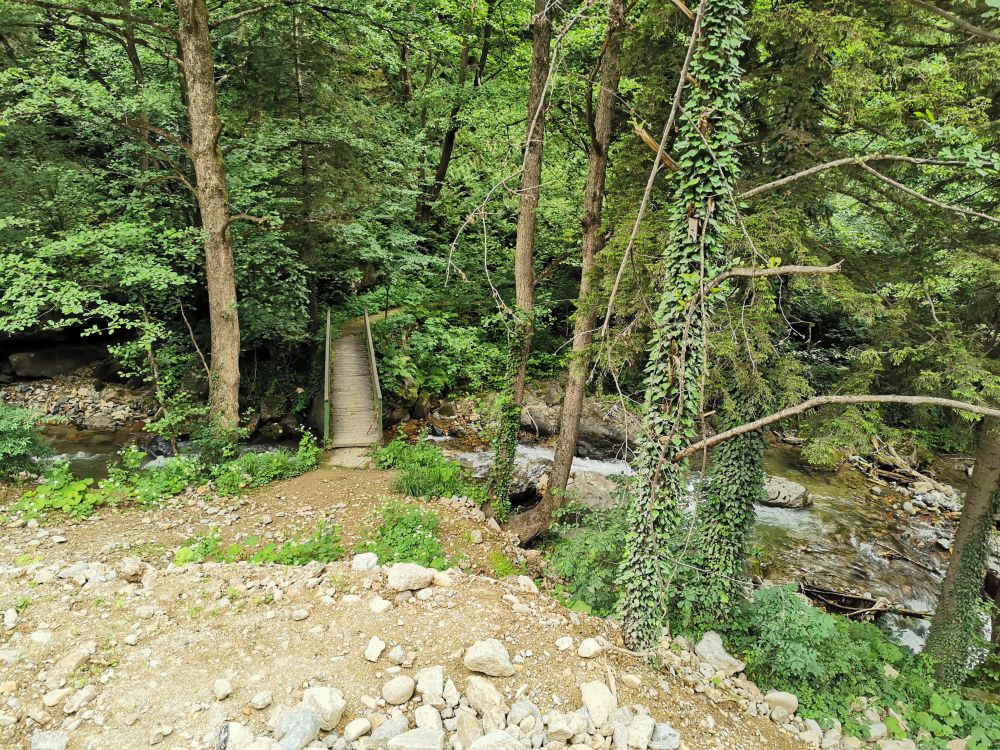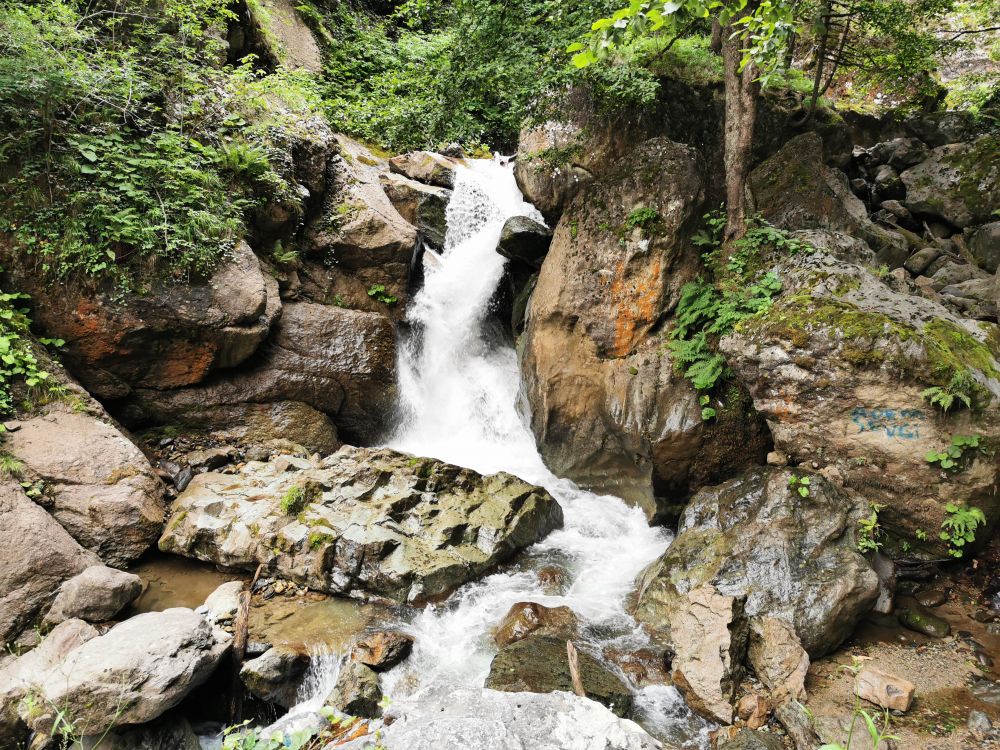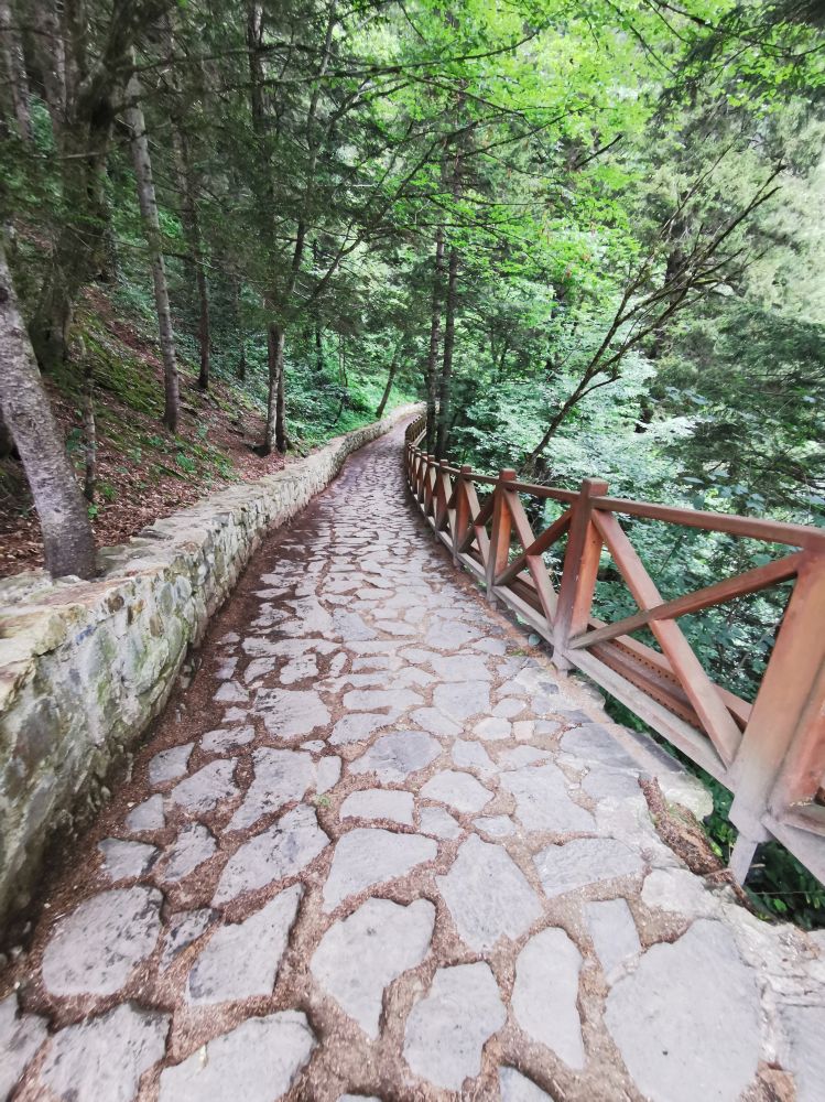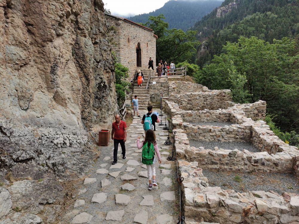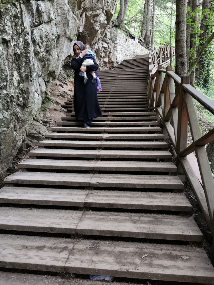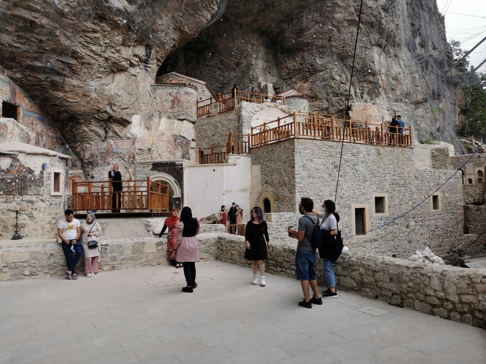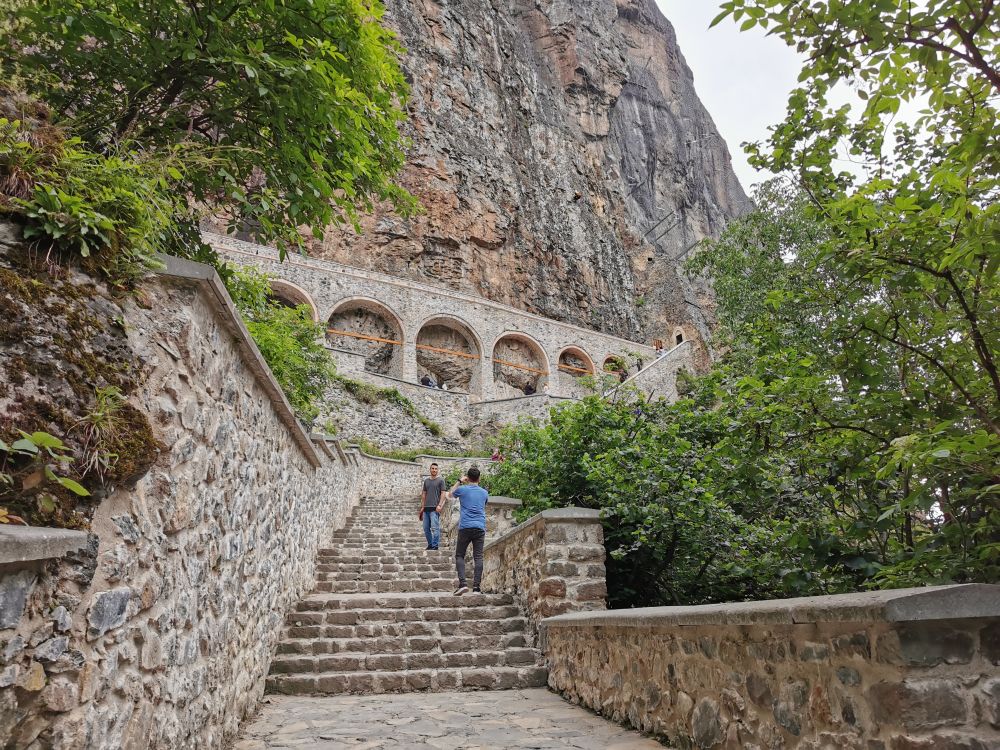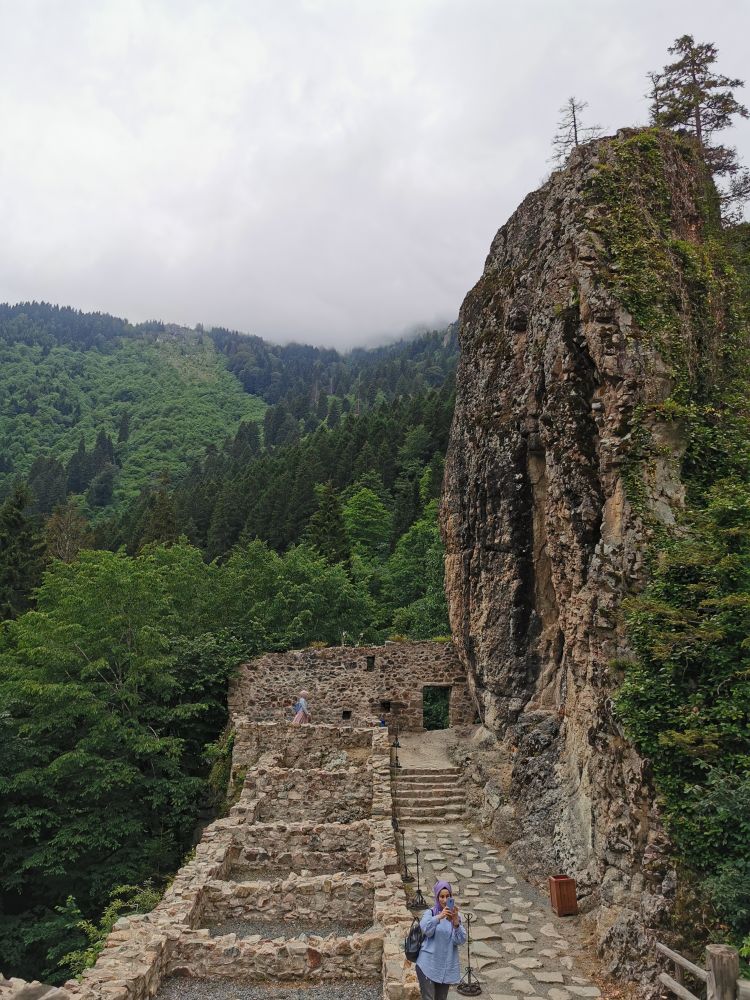 我对弥撒不感兴趣,我只想看看这个被列入世界文化遗产的修道院如何地卓尔不群。在小巴停靠站的旁边,我发现这个被修在一个天然洞穴周围的修道院有一个“弟弟”-圣瓦瓦拉教堂(Ayavarvara Church)。虽然这个教堂内部和外部的废墟都不值得看,但站在外部的观景台上,不仅可以看到周遭宜人的美景,更可以远眺气势不凡的苏美拉修道院的一角。若想近距离欣赏苏美拉修道院,得沿着山坡走完300多米的栈道。走在森林里的栈道上,我有一种久违的感觉。离开土耳其的爱琴海岸和地中海岸,我就很少闻到浓浓负氧离子的味道。半个多月的时间,我不是在秃山荒漠中走过,就是在高山草甸中穿行,我已忘记郁郁葱葱是什么样的景象。再次被温湿的气息包裹,我不禁绵长地呼吸,尽情享受大自然无私的馈赠。