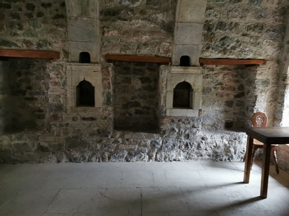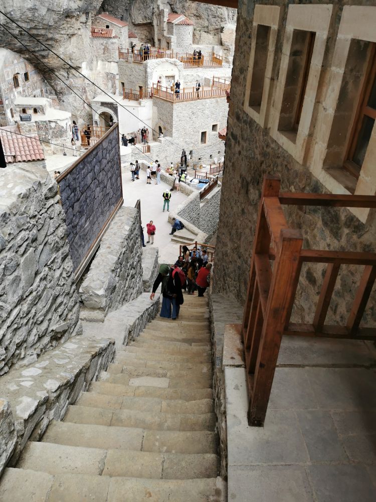 慢慢悠悠走完栈道,眼前是一片宽阔的平台,看起来苏美拉修道院的建造方式跟用“挂钩”方式建造的山西悬空寺并不相像。黄墙红瓦的修道院历经了几个世纪的洗礼后而呈现出6层楼的架构,内有岩石教堂、10个大小不等的教堂、厨房、圣泉、客房、学生宿舍等72个房间,还有一座藏书丰富的图书馆及一个已成为废墟的水渠,最初的钟楼流失在了岁月的风沙里。虽然整个修道院外观很漂亮,也很有气势,但内部却很简朴。走入其内,就像走入了小迷宫,一个小房间连着一个小房间,中间参杂着小教堂。真难想象,千年前的修士们是怎样在这里生活的。像我这样的凡人恐怕很难适应这种艰苦生活,只有真正的信徒才会摒弃尘世的繁华与喧嚣,不惧困苦,追随信仰,在绝壁上搭建起自己的心灵驿站,苦并乐着。