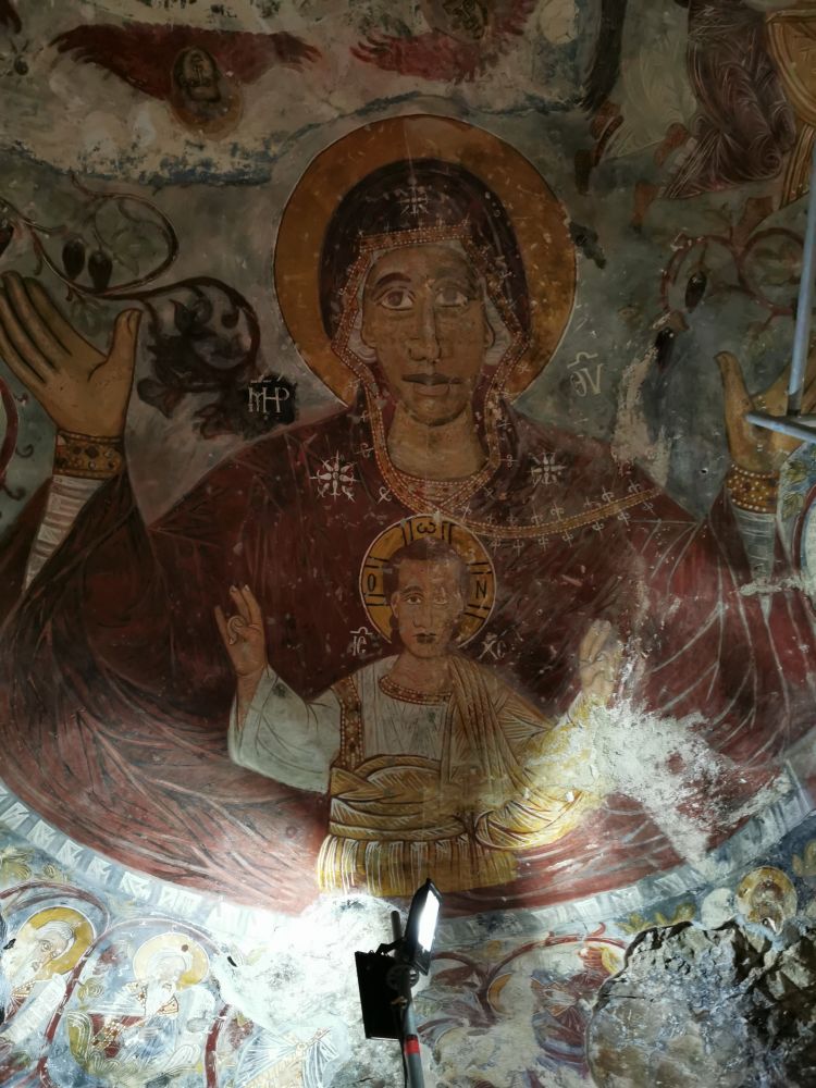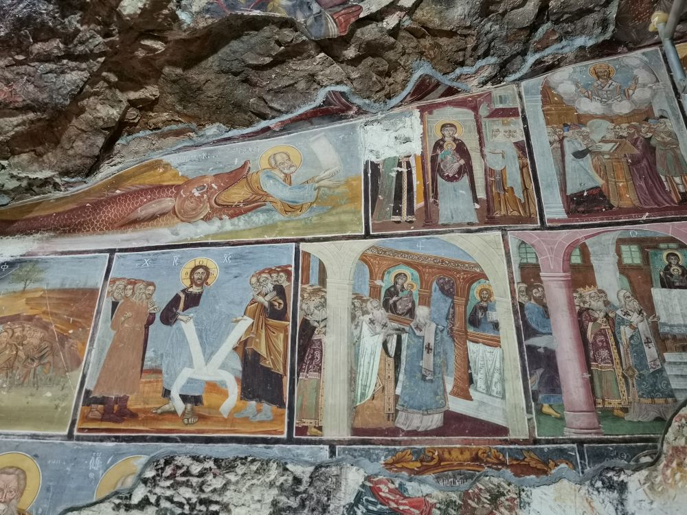 我为这些修士们不屈不挠的精神而暗暗鼓掌,也为他们在数个世纪里留下的文明印记而拍手称快,这些文明印记即是苏美拉修道院的重头戏-教堂墙上的壁画。这些壁画跟厄赫拉热峡谷和格雷梅露天博物馆石窟洞穴的壁画不管是内容还是色调都很相似。壁画主题是圣经故事,从圣母玛利亚到耶稣的生活场景,从旧约中提到的先知到各种圣徒,从创世纪到上帝的训诫及亚当夏娃偷吃禁果等,无所不包。 因为我已经看过类似的湿壁画,所以并没有被这些残破的壁画吸睛,但站在修道院宽阔的露台上,看着满目的绿色,拥有这片“黑海桃花源”之地的本都王国的历史一瞬间跃入了我的脑际。