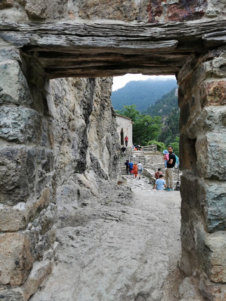 若要看到修道院的“真容”,可以步行爬山50分钟左右,也可以乘坐小巴。我想节省体力,于是买了小巴的往返票和修道院的门票。门票75里拉,不到10美元,很便宜。在小巴绕山而行时,我远远望见了建在一千多米高悬崖上的修道院,那悬空的样子,让我一下子想到了山西大同的悬空寺。