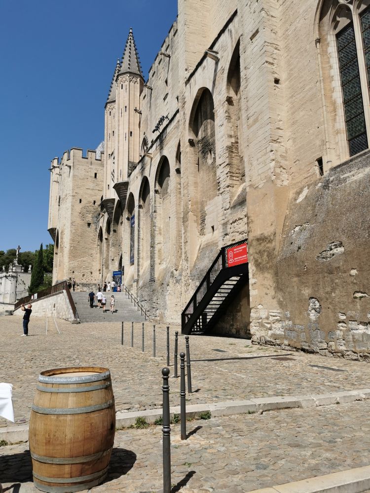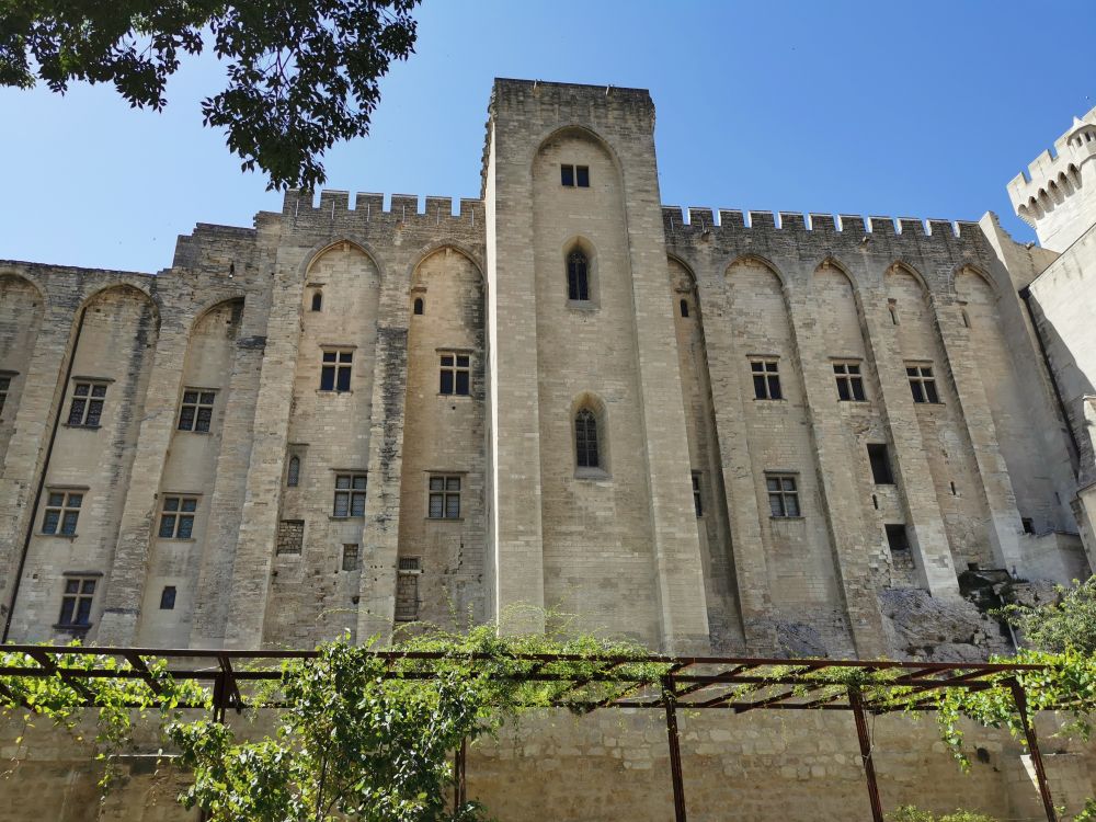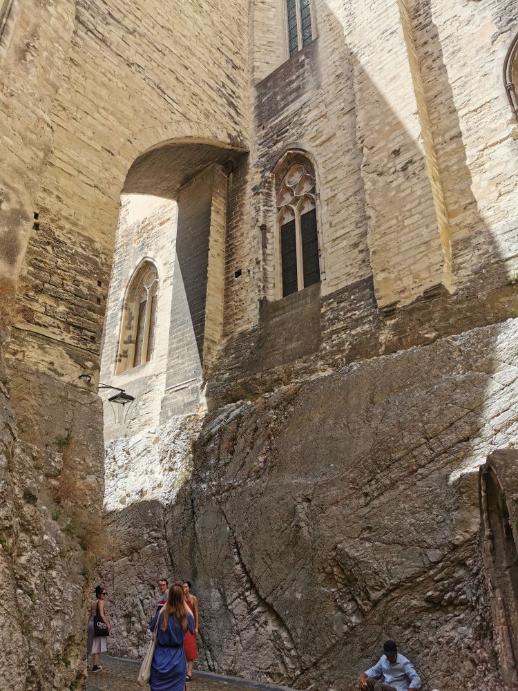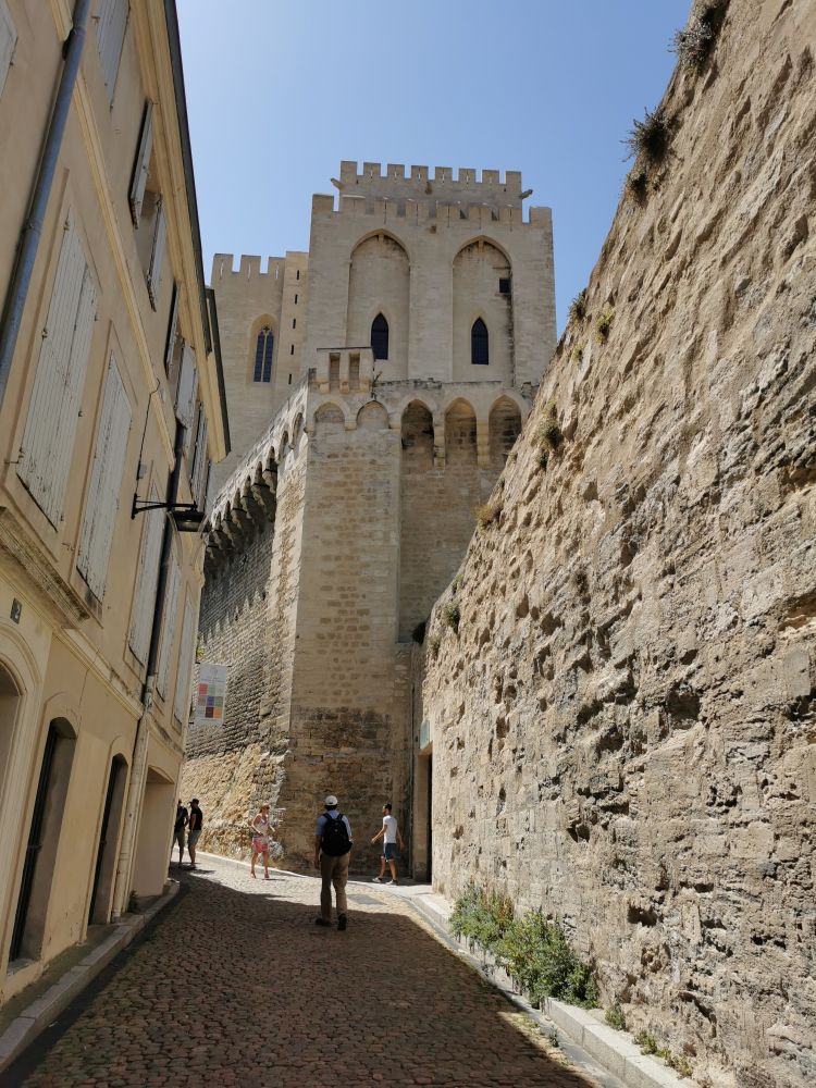 我们的参观从罗马教皇的居所教皇宫开始(Palace of the Popes)。由白色石灰岩建成的教皇宫除了是一个宫殿以外,也是一个军事碉堡,有8座塔楼。坐落于城市的最高处的它看上去很古朴,既没有“雕龙画凤”,也没有“穿金戴银”,但面积很大,相当于两个足球场面积,是中世纪最大的哥特式建筑。自从它建成后,先后有7位教皇在这里居住过。教皇宫包括罗马式的旧殿和哥特式的新殿,据说内部曾经非常奢华,壁画都是意大利锡耶纳学派大师的作品。可惜在法国大革命期间,内部陈列的物品被洗劫一空。我们去的时候,教皇宫的部分区域正在被用作一个摄影展览,其它区域关闭。