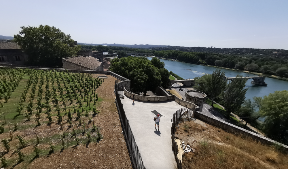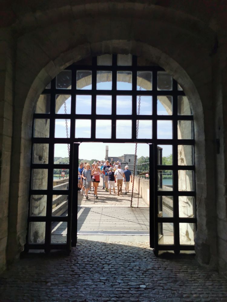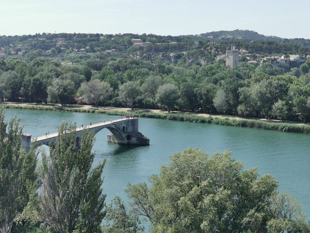 哪也进不去的我们只能在城里乱逛,期待有卡尔卡松城堡那样的旅游品商店和米其林餐厅,可是小城安静得很,什么也没有。无奈我们只好沿着总长近5千米,保存完整的城墙遛弯儿,眺望罗纳河的美色,被列入世界文化遗产的圣贝内泽桥(Pont Saint-Bénezet)随即映入了眼帘。