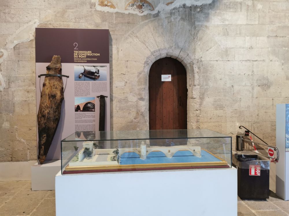 今天,要想走上此桥,得花费5欧元,而且必须是现金,这是我们在法国一个月的行程中唯一不能用信用卡的地方。不过,5欧元里带中文解说。其实,也没什么可听的,只是桥的历史。说原来总长900多米的它在洪水中不停倒塌,又不停被重建,终于在17世纪中叶的特大洪水后被大部分冲毁,然后再也没人愿意修复它,于是形成了断桥。桥上有一个小小的博物馆,还有一个小小的教堂,是献给那位被大家当圣人供奉的牧羊人的。