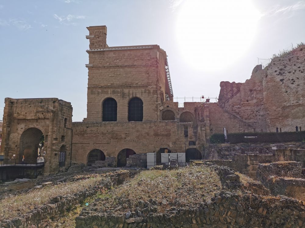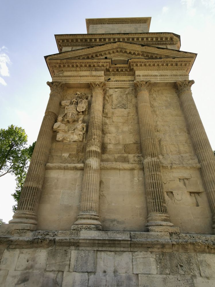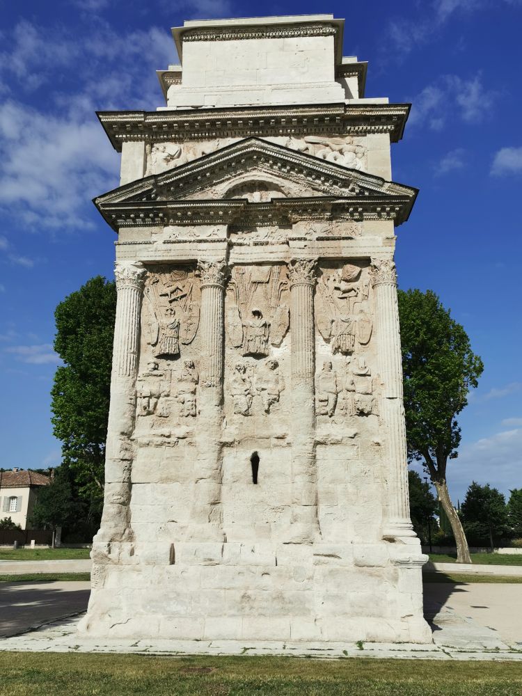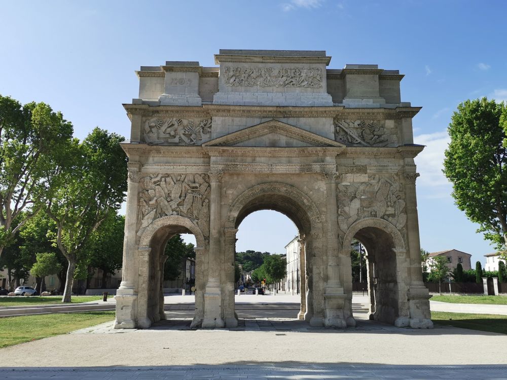 这座凯旋门是罗马帝国幸存下来的最古老的凯旋门,意大利罗马境内的君士坦丁凯旋门即是仿照它而建的。此凯旋门也建于屋大维统治时期,用以颂扬凯撒大帝征服高卢的战争。屋大维的继任者提庇留重修了此门,用来庆祝罗马军团在莱茵河岸大胜日耳曼部落,凯旋门内的铭文就是献给他的。可是看过了君士坦丁凯旋门和巴黎凯旋门的我也没觉得这个门有什么特殊的地方,它只是世界文化遗产中的一员而已。
