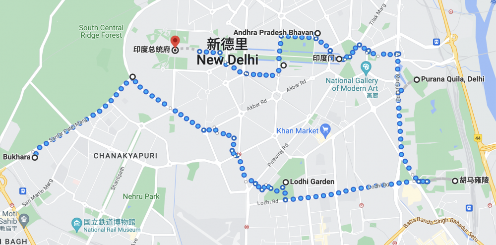 从胡马雍陵出来,我没有直接去印度门,而是直接打Uber去了曾在2007年以唯一入选亚洲最佳餐厅而名声大振的Bukhara餐厅。据说位于新德里的这家餐厅擅长制作印度西北边境的风味美食,比尔盖茨和克林顿等都曾光顾于此。我到这家餐厅吃饭,并不是因为很多名人到访过这里,而是因为我从顾特卜塔到莲花寺,再到胡马雍陵,沿途我就没见过一家餐厅,可我肚子已经饿得咕咕叫了。在胡马雍陵,我遇见一对带婴儿的小夫妻,问他们附近有没有饭店,他们上网查了一下,也说没有。我说我知道一家网友推荐的,于是我们三个人一起打车去了这家餐厅。在车上,他们告诉我,他们来自孟加拉国,男生是海军军官,到各个国家受训,还去过大连一个月。走着走着,男生突然说他妻子的姐姐来了,要去车站接,于是把我送到餐厅后,他们便离开了。
