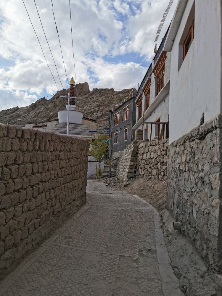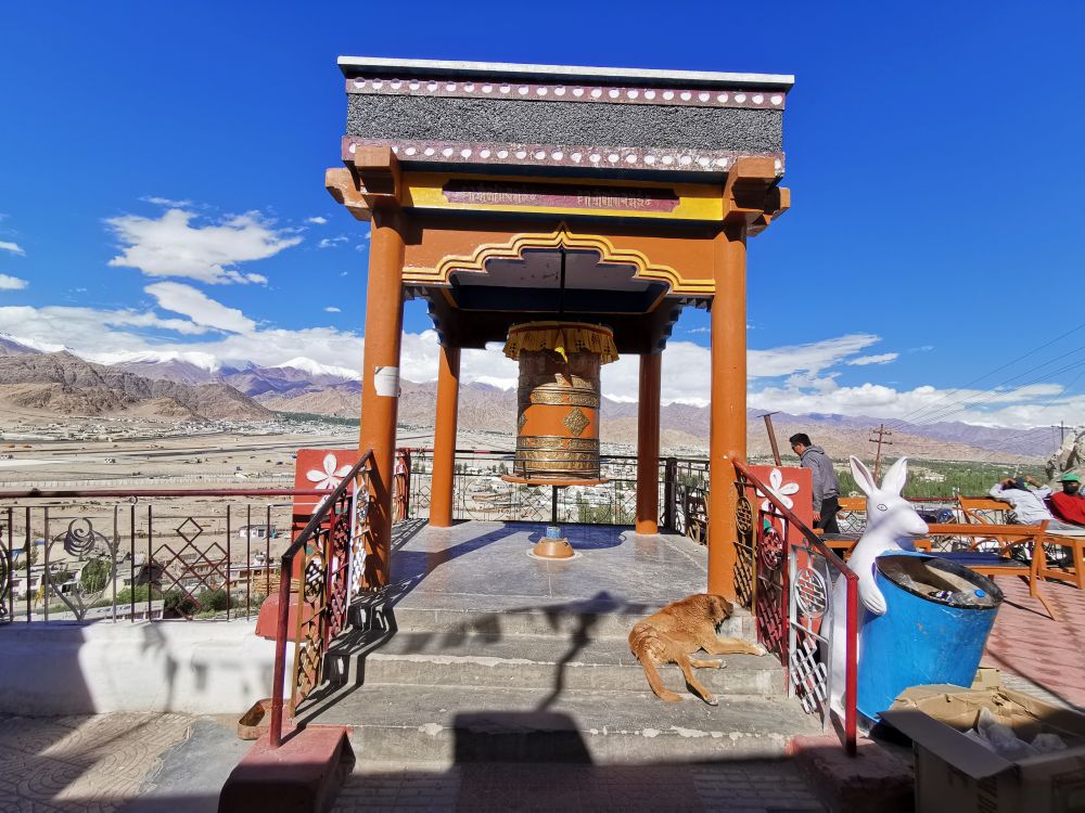 这个藏传佛教寺庙离列城只有7公里。我们的酒店在列城的市中心,从窗口就可以看到列城王宫。到达酒店后,我们没有直接休息,而是让司机送我们去了王宫。虽然整个拉达克的气温很低,我穿着羊绒衫刚刚好,但高海拔让我觉得阳光分外刺眼。我不想在阳光下爬坡,走到3500多米高的王宫,只好烦劳司机送我们去。