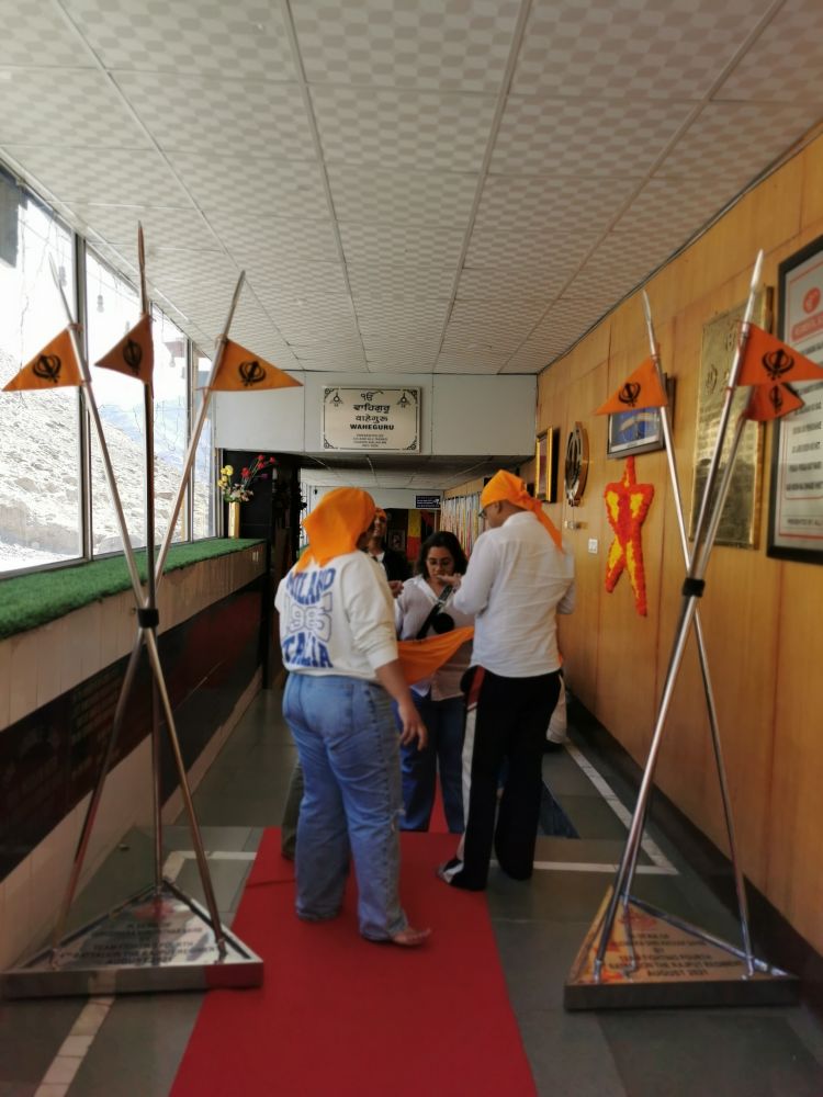 这个地处海拔3600多米的锡克教寺庙建于1517年,为纪念锡克教创始人访问拉达克地区而建,最终此地成了他的安息地。这里的香火很旺盛,停车场上停满了车,让一路上孤孤单单的我们觉得很不适应。外面普普通通的它里面却很不一样,我们要先拖鞋,然后洗手,再趟过洗脚池,最后用寺庙提供的头巾包好头发才能进入。寺庙的大厅跟清真寺一样,也空空荡荡的,只有锡克教创始人的遗体安放在大厅里,显得格外醒目。墙壁上挂着锡克教历任教主的头像,这是我第一次参观锡克教的庙宇,觉得很新鲜,我发小儿说这里比藏传佛教的寺庙好多了,至少多姿的色彩让人眼前一亮。走出庙宇,拾台阶而上,上面有一个带佛塔的小屋子,里面不知道是不是安葬着什么人,我在里面还发现了麦克风。