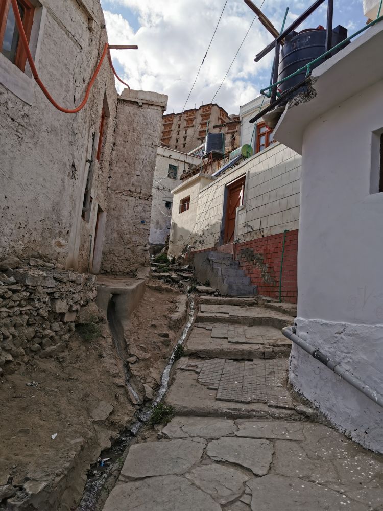 让我讨厌的还有王宫的内部。本来外表看上去还不错的王宫,里面却是九曲回肠,几乎每一处都“家徒四壁”,让我想拍照的欲望都没有。有的房间还有尿味,气得我真想问候一下在此小便的人的祖宗。而宫殿较大的房间和走廊则被改成了没什么意思的介绍拉达克历史的展厅,只有站在王宫空旷的屋顶上,看着远方的雪山和苍劲的山峰,才让我觉得列城王宫还是挺不错的。可是,当我们从王宫走入老城的小巷,准备回酒店时,看到小巷中人和动物的粪便以及满地的垃圾时,我的厌烦感又上来了。