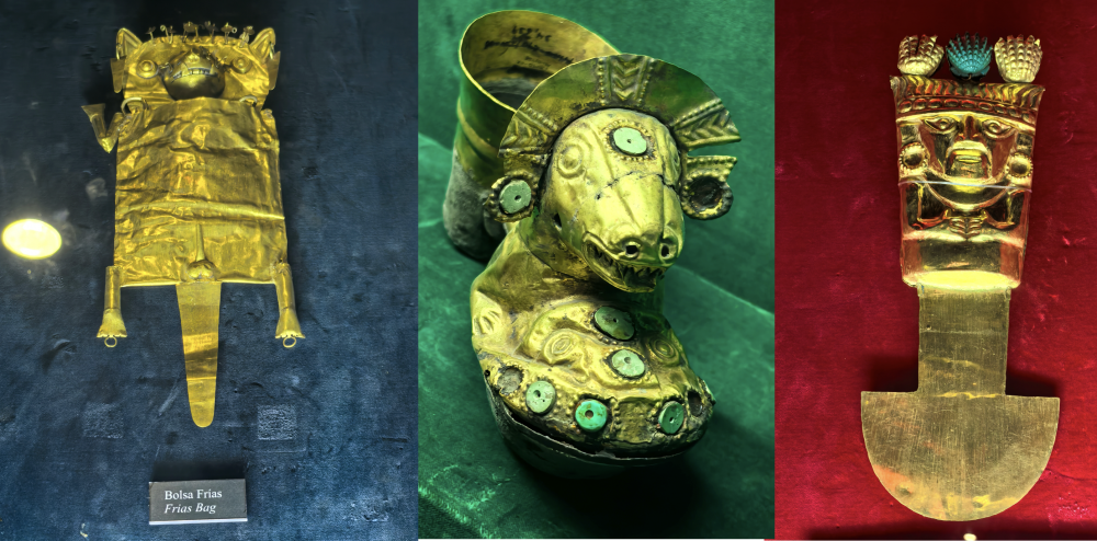 博物馆坐落在一个小花园里,一进去就让人觉得赏心悦目。地面一层展示着世界各国的兵器,有日本的武士刀和铠甲、欧洲贵族的刀剑等,其中包括皮萨罗用过的剑和巴伐利亚路德维希一世用过的剑,还有埃及黑曜石匕首等。地下一层才是黄金展区,里面有各种各样的黄金祭祀器皿、黄金生活饰品、黄金动物和人物雕像,以及各种各样的黄金面具等。有的黄金面具眼睛上镶嵌着绿松石;有的鼻子上穿着两个吊坠;有的头上带着冠;有的面目平和;有的怒目圆睁,呲牙咧嘴。虽然这些黄金面具无论从黄金厚度,还是精美绝伦上都无法跟古埃及图坦卡蒙法老的黄金面具相媲美,但比古希腊阿伽门农的黄金面具要强数倍。特别是眼部带有绿松石的黄金面具,西琴先生说,南美洲根本没有这种矿石,它的首次开采,是在公元前5前年的西奈半岛和伊朗,这些镶嵌技术也来自近东的苏美尔。