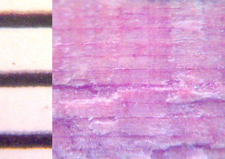 解剖镜下普罗米修斯径向面的测量:左侧刻度线间距为1mm。从第