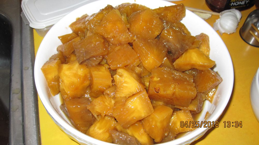 然后又把昨天新买的菠萝切成块放进玻璃罐中,加上椰子红糖发酵。
