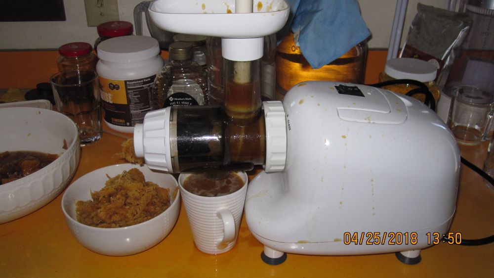 把玻璃罐中的菠萝渣滓捞出来用榨汁机把汁液榨出来,灌了一大瓶还有两小瓶 ,榨得不算干的渣滓放一点酵素汁液当饭后甜点吃了帮助消化。