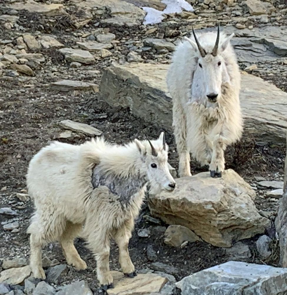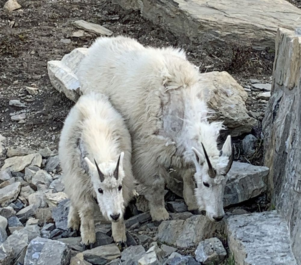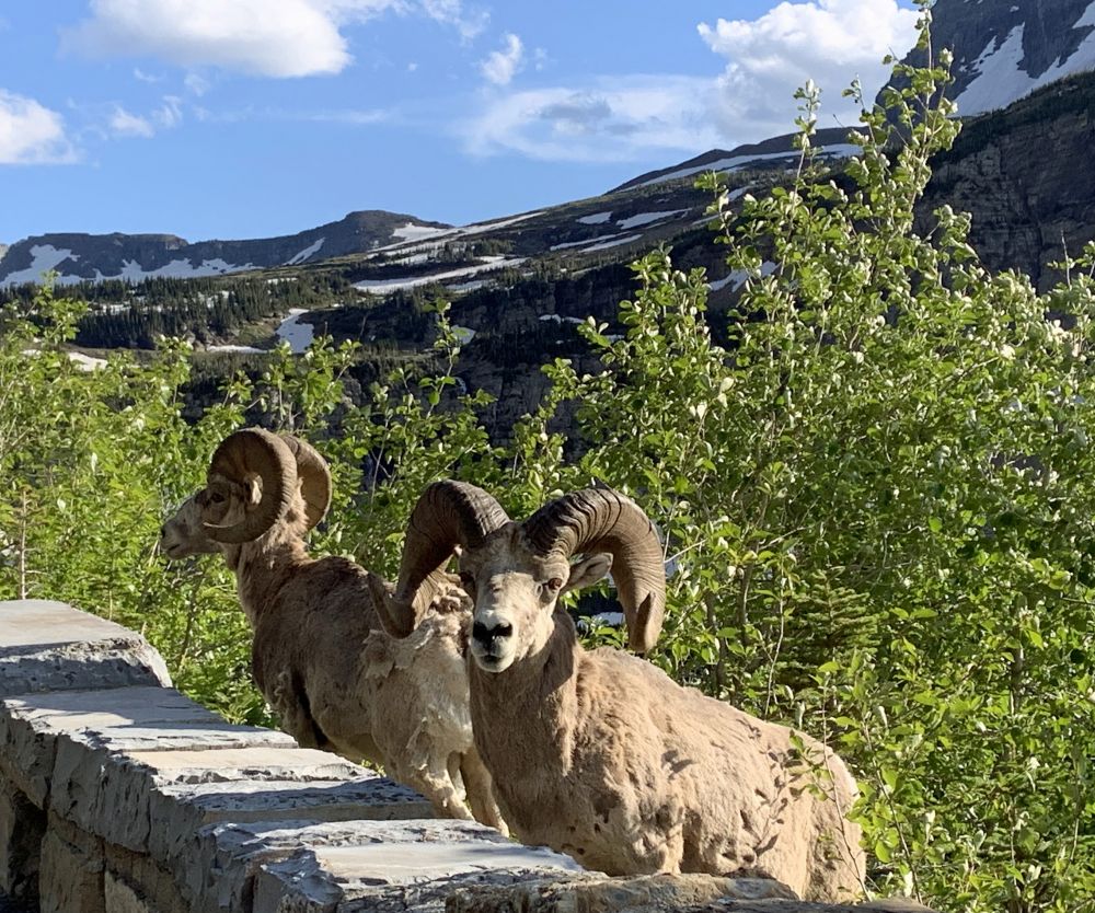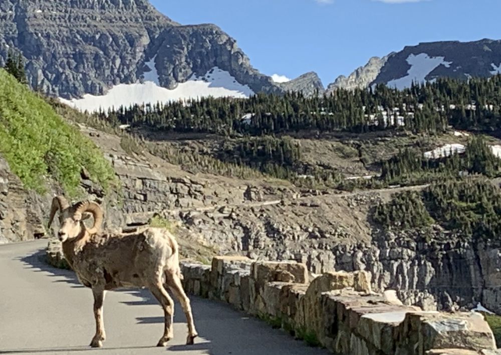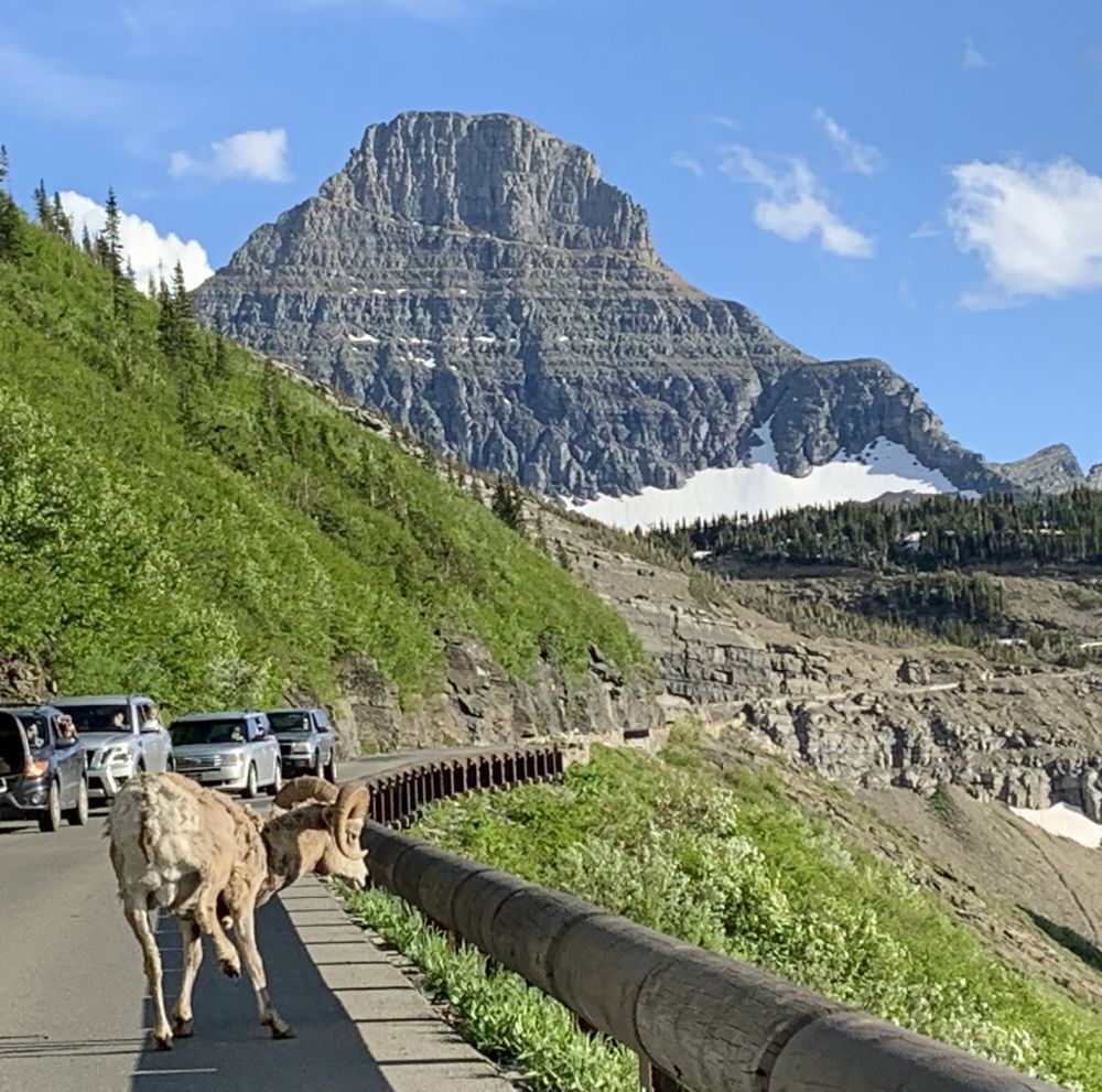 非常幸运的是,再返回时接近Logan Pass的时候,看到了大角羊--Bighorn Sheep. 还不只,而是一群。就在路边和路上。五月中专程去科罗拉多的Rocky Mountain NP追寻大角羊,费时两天,才远远地拍到一只小羊。这次居然得来全不费工夫。