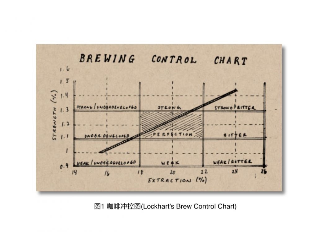 Lockhart 以问卷形式寻找咖啡爱好者心目中的完美咖啡,给出一张著名“咖啡冲控图”(Brew Control Chart )【2】,九格图中心区为最佳咖啡区域,SCA的“咖啡黄金比例”就来自于Lockhart的发现。他创造性地量化了咖啡口感“强弱”和“苦涩”概念,一个称为冲泡强度(Brew Strength),它定义为一杯咖啡里总固体溶量百分比(Total Dissolved Solid ,TDS %), 作为图的Y轴,具体说,如果冲泡好的一杯100克(毫升)咖啡含有(冲泡出)1.1 ~ 1.3克可溶咖啡固体,这杯咖啡达到一个指标(口感强弱正好,或者大多数人喜欢的口感强度)。另外一个变量叫提取率(Percent Extraction, PE%), 它描述了这样一个概念,如果用100克咖啡豆(冲泡前),研磨成粉末,一般最大只有30%固体可以溶入水中,而且其中大约20%可溶咖啡固体是可口宜人的或者苦涩适中,因此PE是冲泡咖啡需要控制的参数变量,TDS的最佳范围1.1-1.3%应该来自于咖啡粉的PE20%。因此上面提到的咖啡冲泡细节决定了提取率(PE%)。