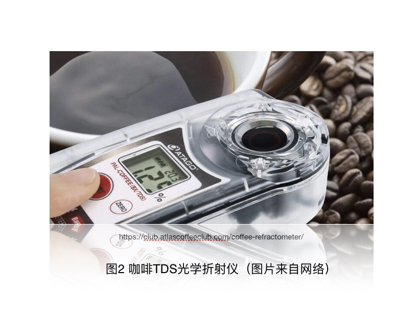 作为咖啡爱好者,有必要知道自己冲泡的咖啡是否完美?答案既没有必要,又有必要。“没有必要”是因为发现咖啡可口与否是自然而然的过程,仅仅是时间问题【3】。但是,如果希望量化自己口味,优化自己冲泡过程,甚至想开个咖啡店,答案是“有必要”,这需要破费一些银子买个小装置($300-$500)。2008年,一个名叫Voice System Technology (VST)公司首次尝试通过简单光学折射率确定咖啡的TDS%,然后计算PE%,设计了小装置(如图2),令人感兴趣,但不是所有咖啡行业人士都待见这个小东西,因为有它,开个咖啡店不再有什么秘密。因此,好咖啡的秘诀就藏在公式(1)里,TDS和PE关系公式(1):