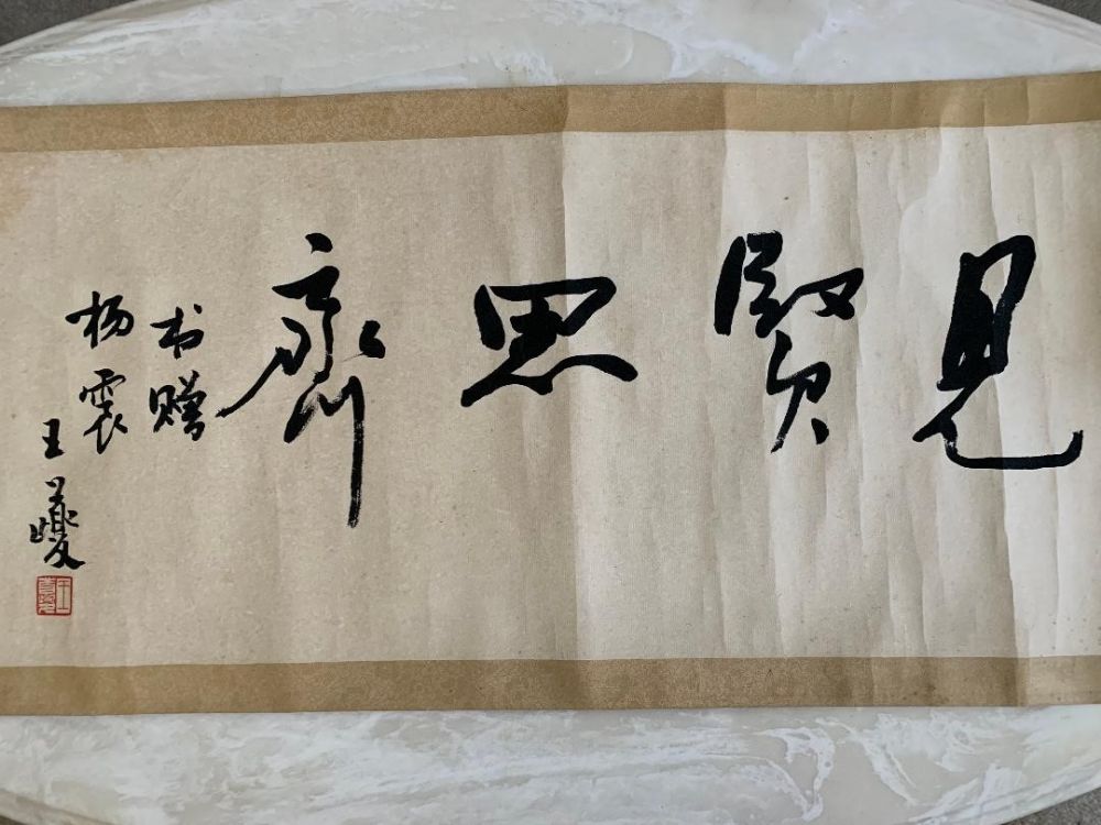 1993年正值两会召开期间,我到北京出差。在北京我打电话到王先生家问他给我写字的事情。王先生夫人朱寿珩教授接的电话,她说王先生是全国政协委员,正在会议上。当天晚上,王先生打电话到我招待所,说和家里通电话时知道我在北京,让我第二天晚上去他家,他会请假回家把给我写的字拿给我。第二天晚上,我如约来到王先生家,拿到了王先生给我的字“见贤思齐”。裱好之后,我把它挂在我书房的书桌前面墙上。1998年我来到美国,也一直把它带在身边。
