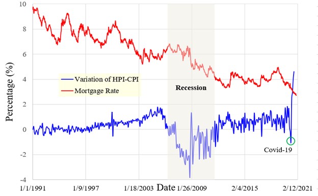 图四, 30年固定贷款的利率和房价指数的逐月变化率 (Variation of HPI-CPI)。