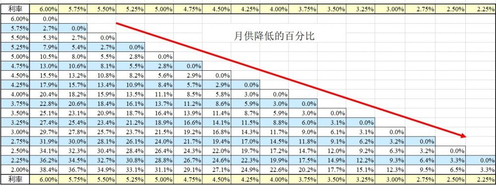 表 利率和月供下降百分比的下降关系