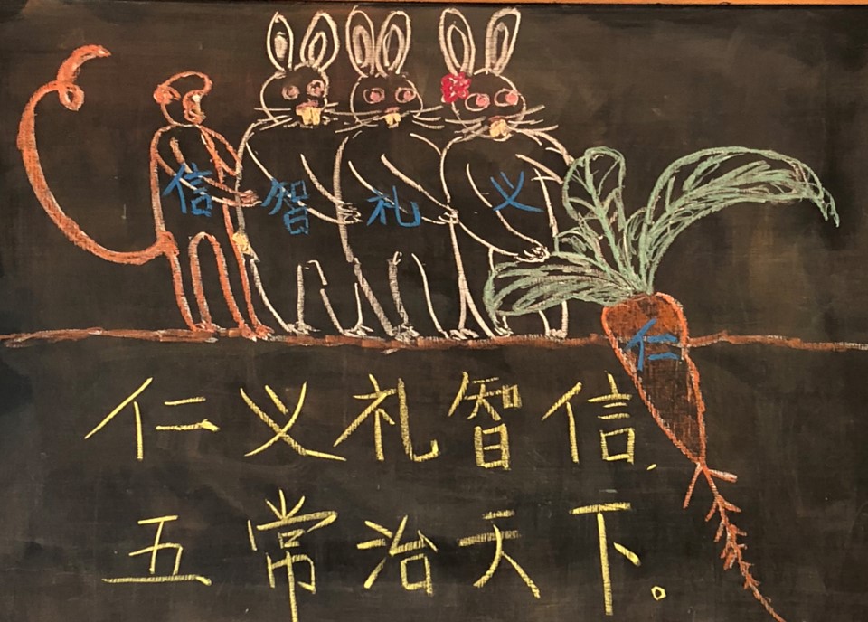 每个社会都有主流价值观,比如美国就崇尚自由平等博爱。中国几千年传统,其主流价值观应该是仁义礼智信。当我在美国教书的时候,我首先教美国学生的就是这个主流价值观,我让他们用毛笔书写五个大字,然后逐一的解释,其中的含义重点指出,这是中国社会的传统,人人都首先审视、使用这个价值观。这个学校是个华德福学校,学生不允许看电视,玩电脑;重视手工和才艺。我有幸在这个学校教书两个月,当然是代工性质的。老师经常出一期版画,让学生观赏也说出他要表达的含义。这里面我就展示我自己的一幅版画--粉笔画。