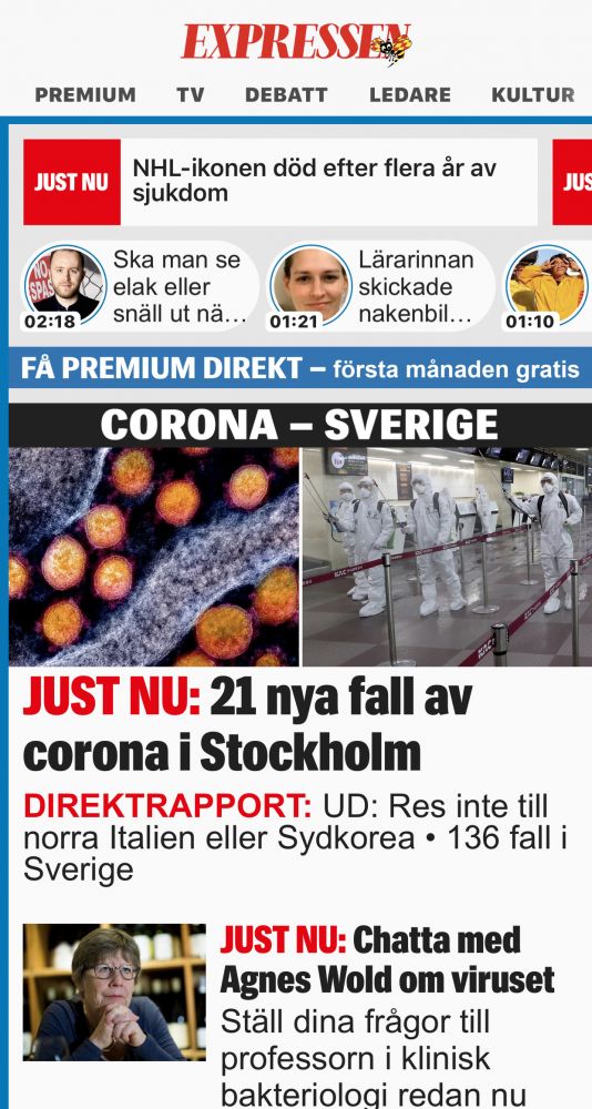 斯德哥尔摩市已经有80个确诊的。今天因为学生感染或者学生的亲人感染,斯德哥尔摩已经有5个学校关闭了。政府叫不要去意大利北部,伊朗和韩国地区旅行。飞机也停止往那些地方运行。我们公司也明确下文不让大家去那些地区出差了。。。