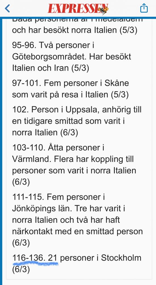 瑞典冠状病毒确诊人数仍然在增加。现在有136个人了(昨天94个、今天增加了41个,斯德哥尔摩增加了21个)