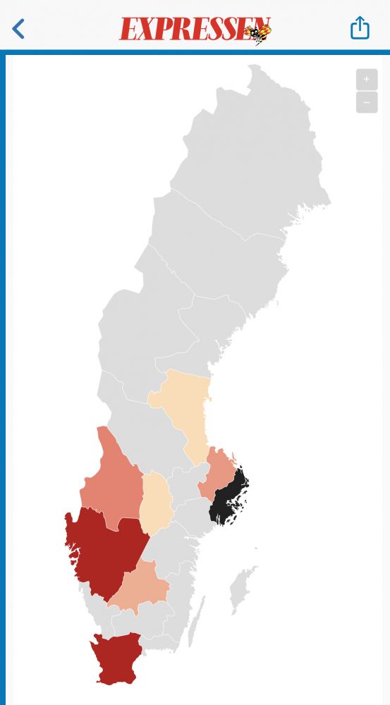 远在万里之外瑞典的儿女叫我这个母鸡妈妈不要紧张,还开玩笑瑞典还有大部分地区没有感染。不行就往北极圈里跑。上图是瑞典地图,最上面最北部最冷的地方完全没有冠状病毒。看样子病毒不仅怕热,也怕冷。。。