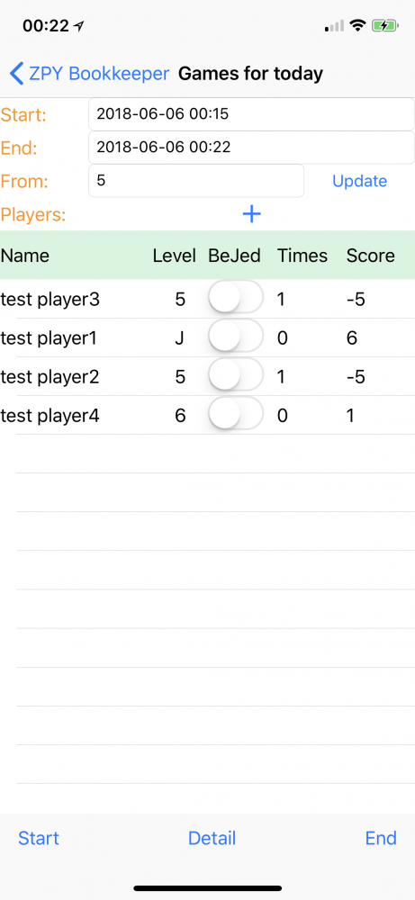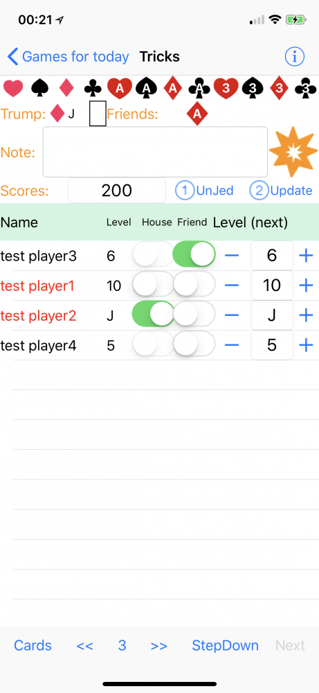 This button is basically overwriting the result from Update button. This is added for the scenario of invalid trick. So after tapping Next button, the on board players will become off board in the next trick. The level for every player keeps as is.