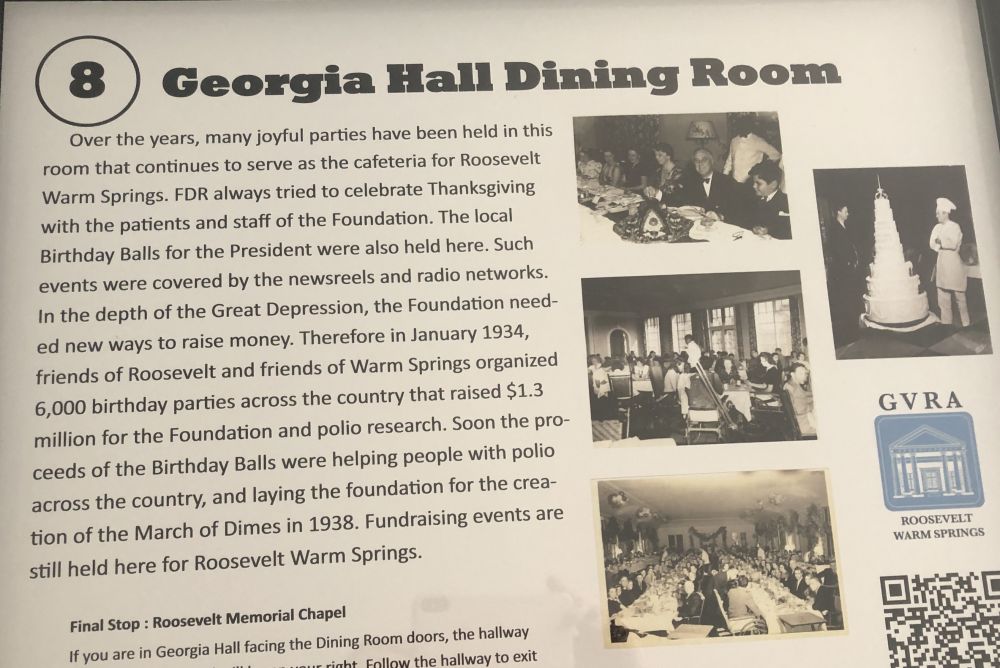 除了修建户外水疗池,FDR还用用自己的捐款买下了暖温泉城一破旧的度假村,进行改造,建立一正规的小儿麻痹症康复中心,让更多的小儿麻痹症患者得到治疗。1927年他与慈善家 Basil O’Connor 共同建立了Gregoria Warm Springs Foundation(乔治亚州暖温泉基金会)。由于当时经济困难,筹资相当不易。直到1933年11月,基金会的第一座建筑楼,也是康复中心的第一座楼,Georgia Hall 峻工,投入使用。大厅宽敞明亮,一侧为接待登记管理,另一侧为Dining Room, 以后很多大型庆祝与集资活动在这里举行。